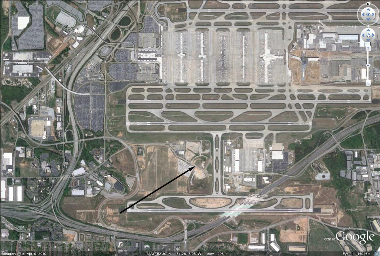 This areal view of the airport runways shows the location of both cemeteries, the black arrow runs between them. Hart is on the lower left and Flat Rock is on the upper right. (Photo Source: Google)
