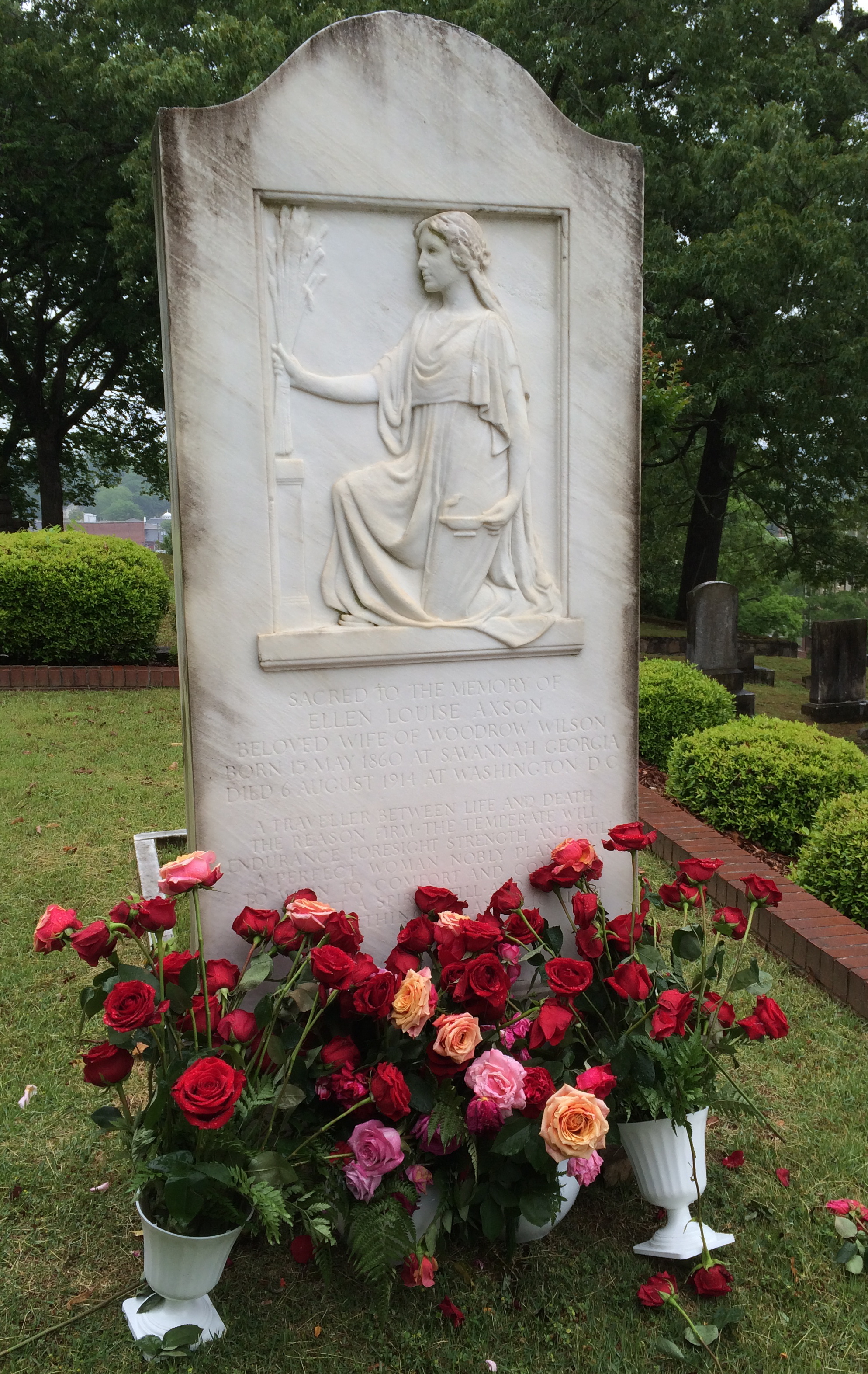 One of the graves I most wanted to see was that of First Lady Ellen Axson Wilson. She was the first wife of President Woodrow Wilson and the only First Lady buried in Georgia. Her monument was even lovelier in person than photos indicate, with beautiful roses placed at the base. Mrs. Wilson was an artist herself and I think she would have appreciated the work that went into the stone.
