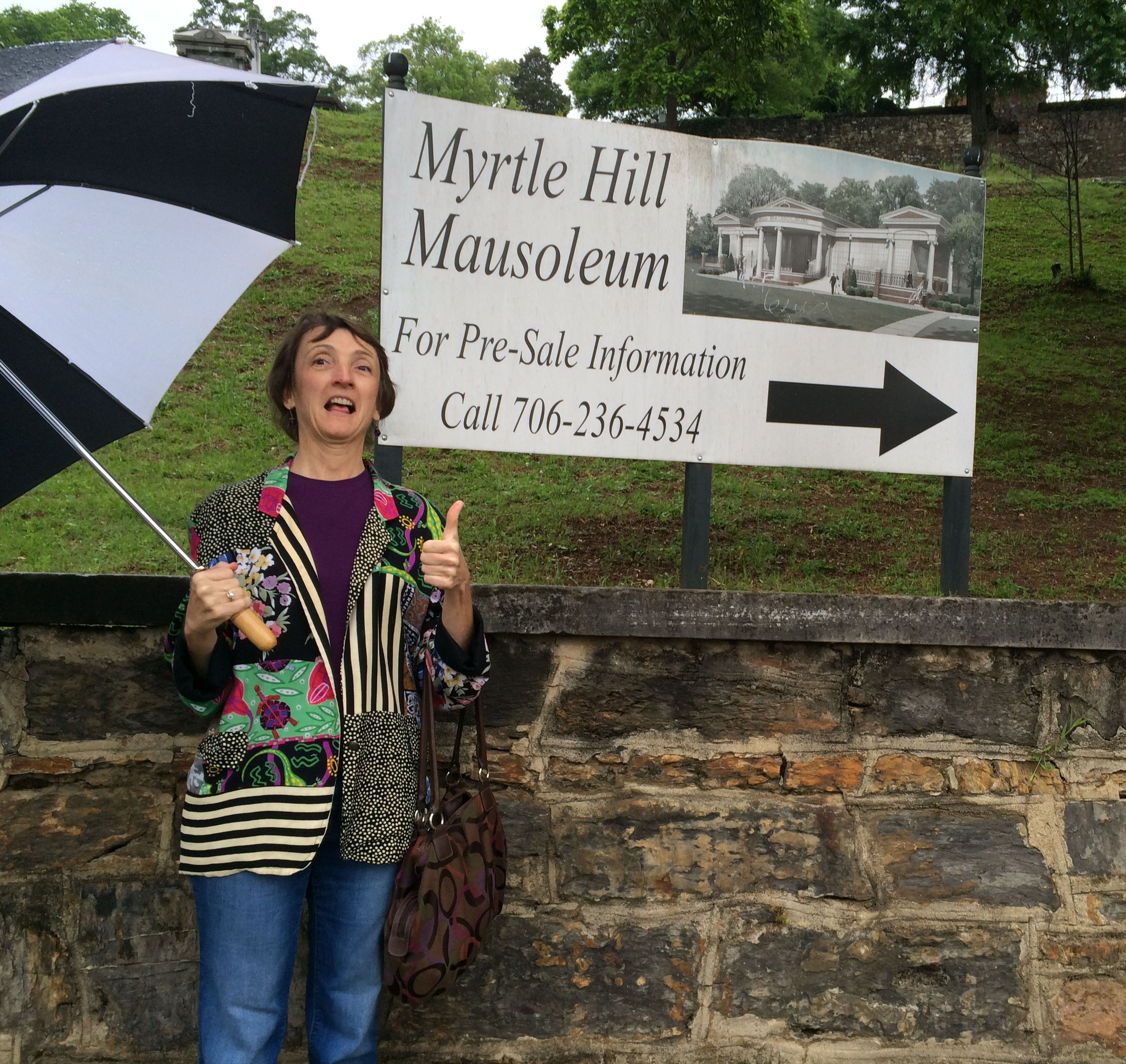 Umbrellas were a necessity during the first half of our hop. Myrtle Hill is still an active cemetery and recently added a new mausoleum, which Sarah gave her thumbs up to.