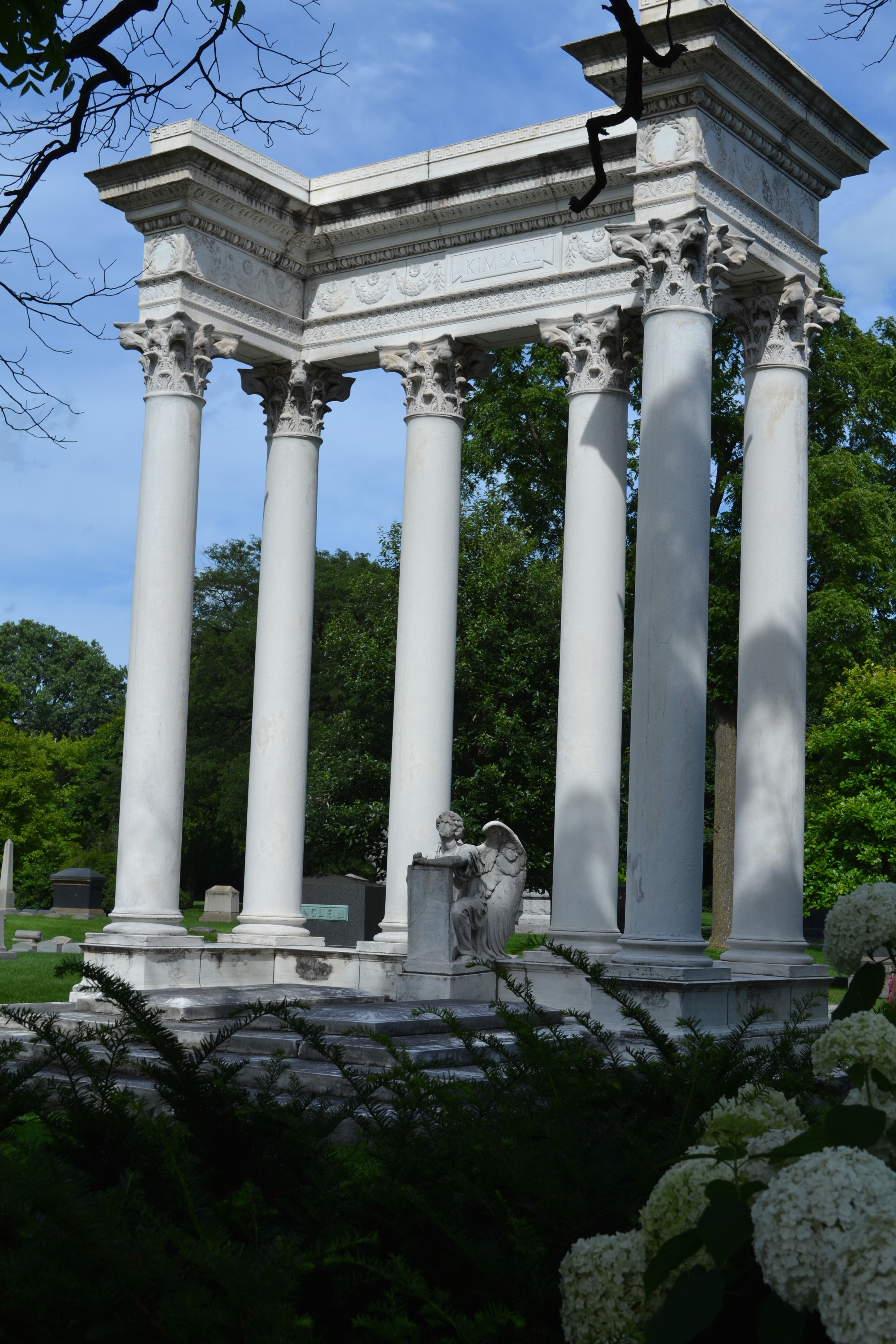 Across the rear are four Corinthian columns, with two more on the sides. Below, an angel kneels, watching over the two graves beneath the floor. The entire monument is of white marble, and was erected in 1907 from a design by the architectural firm of McKim, Mead & White.