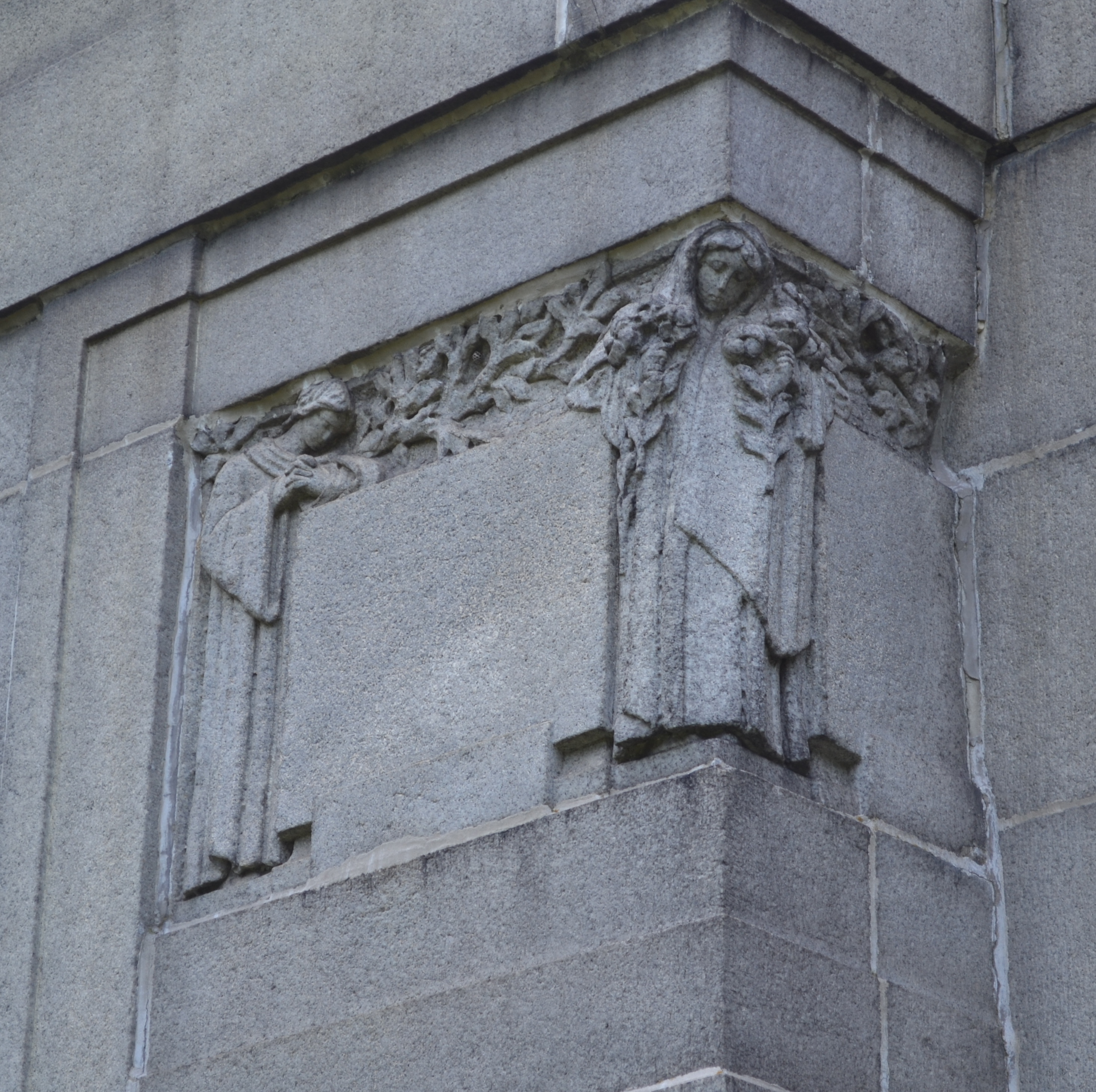 The artist who created this monument, Alfeo Faggi (1885-1966) was known for his stylized forms and anti-Classical approach to the figure. In other works, he sculpted outside the conventional norms. The central figure of Christ is shown surrounded by four figures and the Cross, visible in the right corner. Faggi also contributed works in this style to the St. Thomas the Apostle Church in Hyde Park.