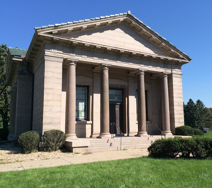The last mausoleum I’m going to talk about is notable for its Egyptian Revival-style motifs. The Bostwick mausoleum is where Henry “Harry” C. Bostwick, a wealthy banker, is interred.