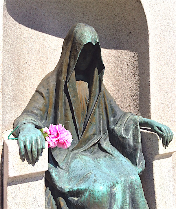 The figure instantly reminded me of Lorado Taft’s ominous “Eternal Silence”, the sculpture at the grave of Dexter Graves in Chicago’s Graceland Cemetery, which was made 30 years before the Wasserburger one. The Marian “Clover” Adams memorial sculpture by Augustus Saint-Gaudens in Washington D.C. is also similar.