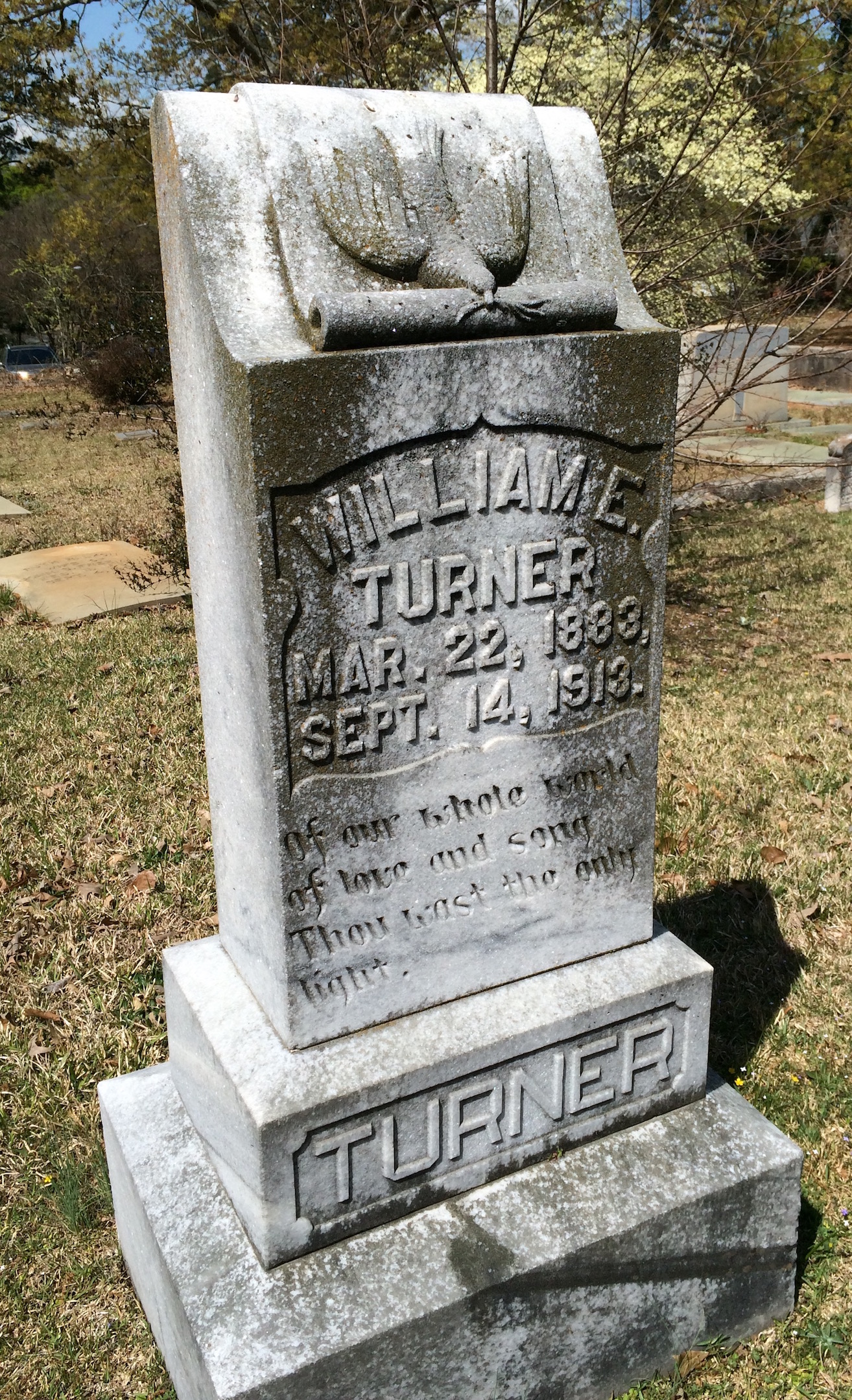 I know even less about William E. Turner, whose marker features a beautiful dove with an olive branch in its beak. I’ve seen this motif before but I’m always struck by it. It’s most often a symbol of peace.