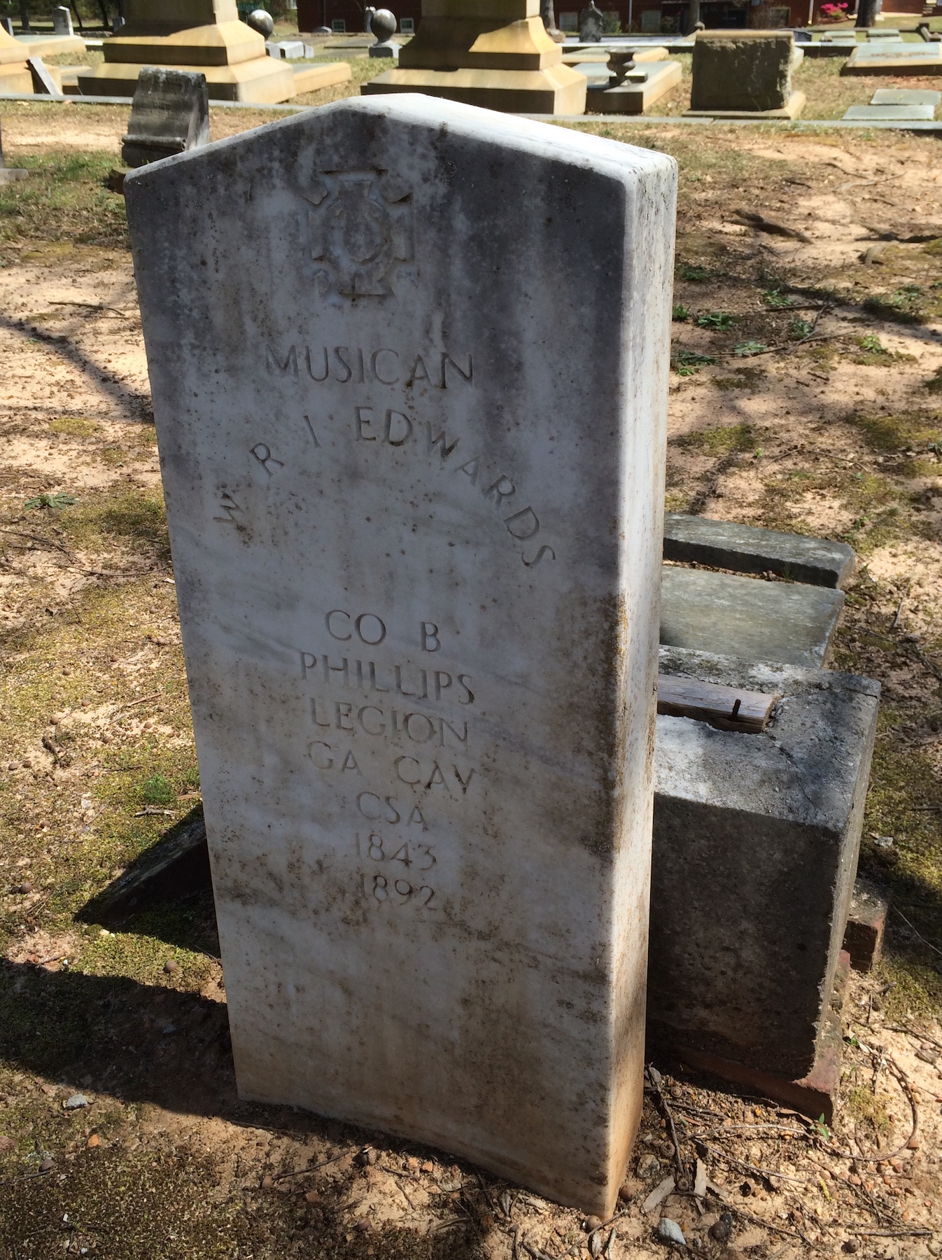 More often than not, the men buried in the Confederate Cemetery lived humble lives and not much is known about them beyond their name and what company they served in. A good example of this is W.R.F. Edwards, a musician who served in Company B of Phillips Legion as part of the Georgia Cavalry. I could find little more about him.
