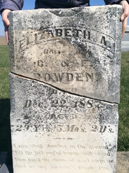 Christopher Bowden and his wife, Elizabeth, emigrated from England to Wisconsin sometime in the late 1840s with their two children. When they moved to Nebraska is unclear, but it was in the 1880s. Their daughter, Elizabeth, died in Wisner in December 1887 at the age of 29. Her marker is broken in two but I had Christi lift it up temporarily so we could photograph it.