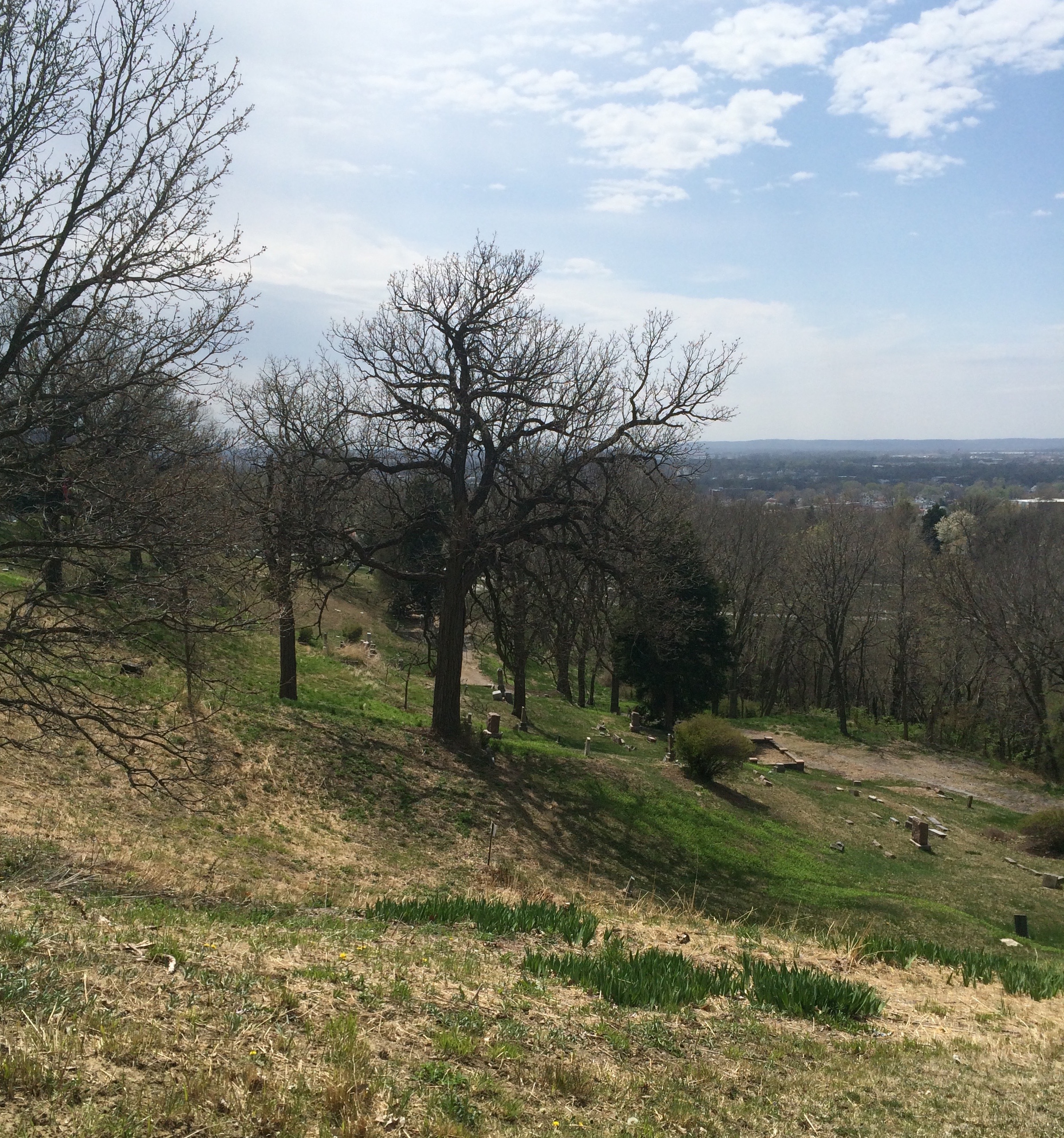 After you enter the front gates, and if you see a dirt road veering to the left, you’ll notice a back hillside that is much less orderly than the rest of the place. The rather sharp incline of the hillside is probably not easy to mow. The graves are scattered here and there with no real plan. And some markers have clearly seen better days.