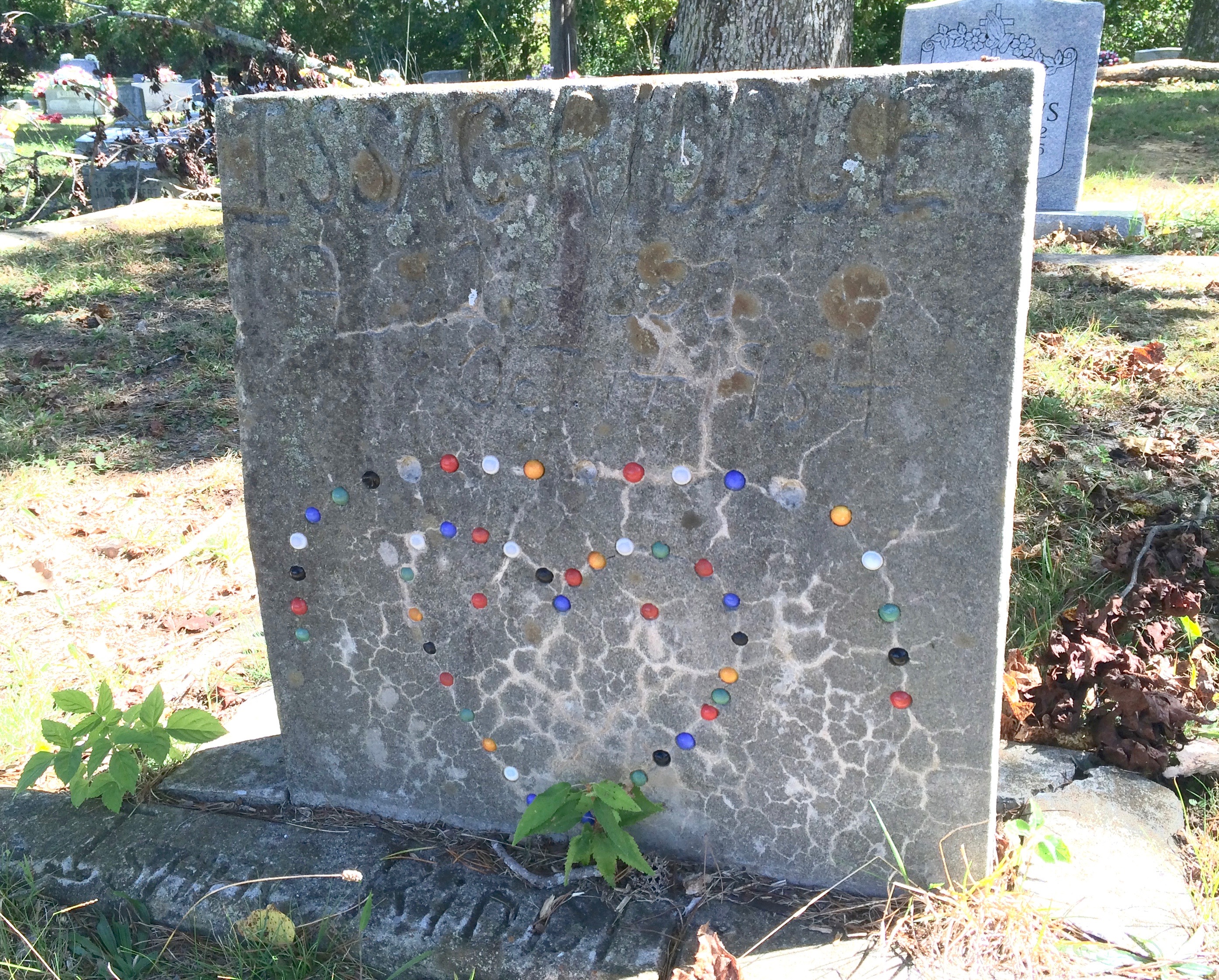 These homemade concrete markers for Maude and Issac Riddle, studded with colorful stones, are two of my favorites. My great-great-grandmother Louisa Claar’s marker is also a simple concrete marker with her name scratched on it by hand.