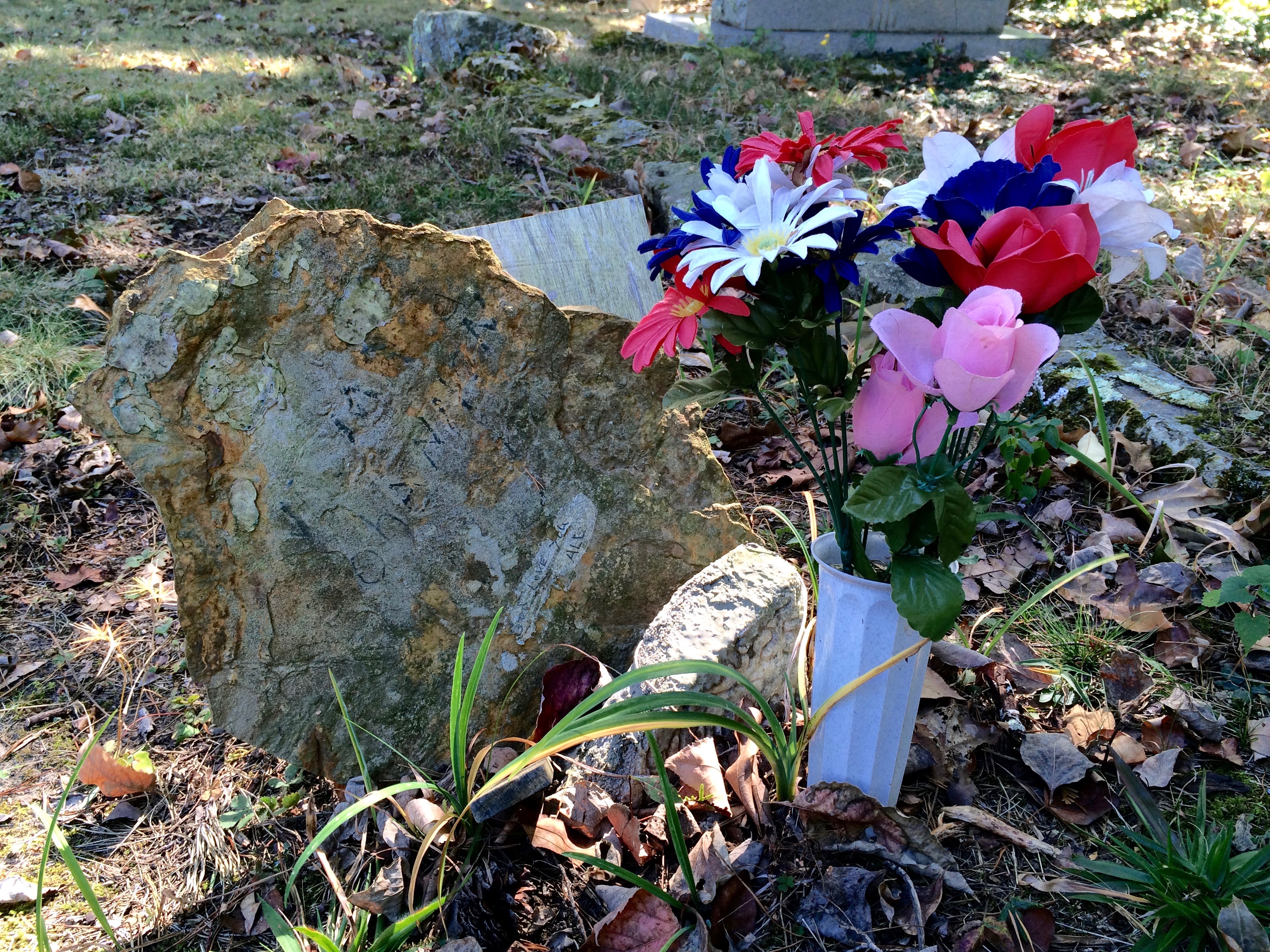 I found a fieldstone with the last name of Bohannon scratched on it, no dates that I could find. There are 34 Bohannons at Whittaker Cemetery. I’m sure they know who it is and still visit often since silk flowers (in great condition) are beside it.