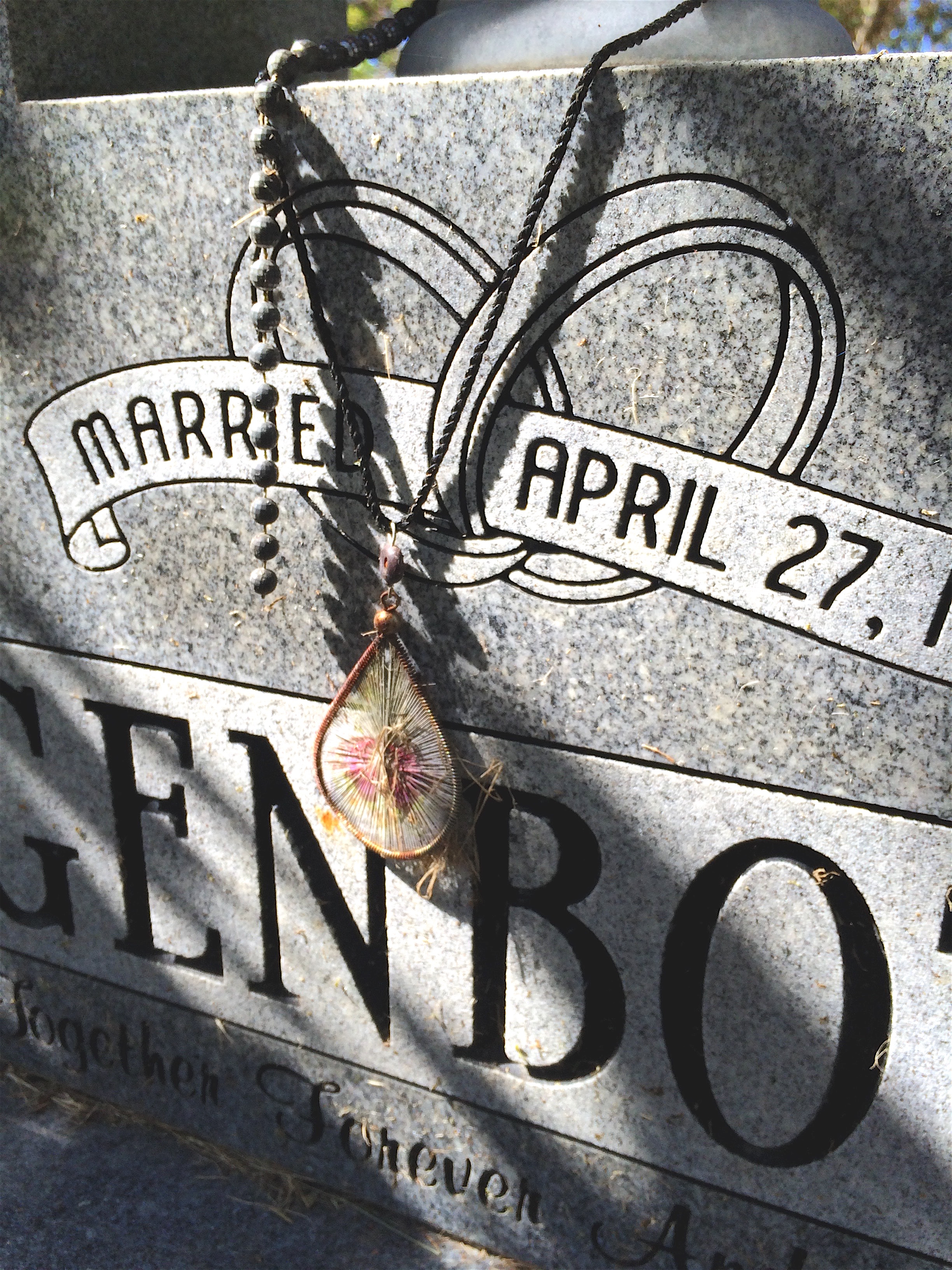 This marker was sheltered under a low tree. The necklace hanging from the urn on top of it made me smile.