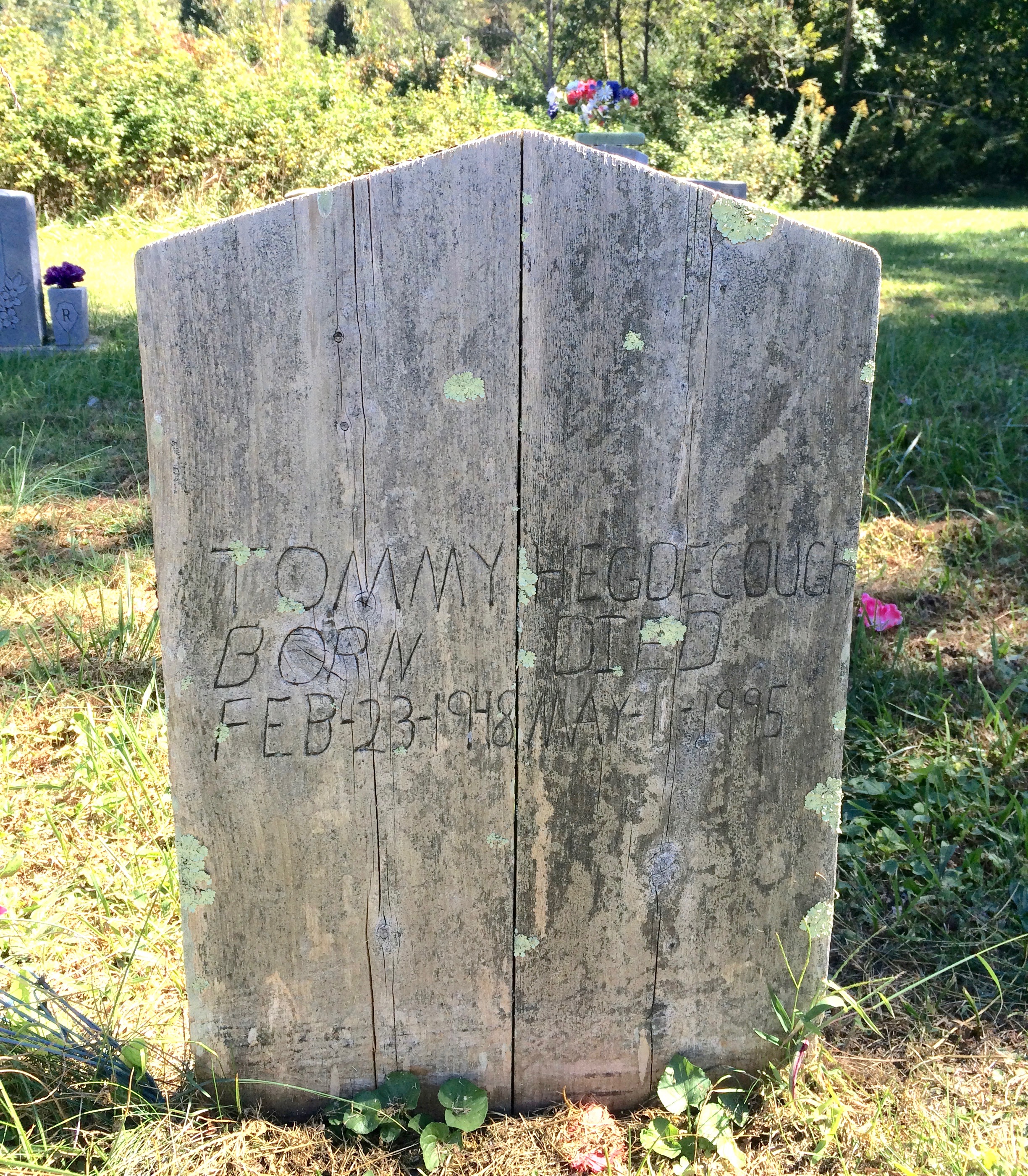 I share this marker for Tommy Hedgecouch because it’s a modern example of an incredibly old tradition that’s been around for centuries. Graves were often marked in the past with wooden markers or crosses. When you don’t have much money, you use what you have. Unfortunately, such markers are very susceptible to the elements and don’t last very long. Few make it beyond a decade or two.