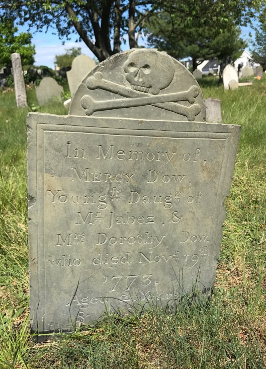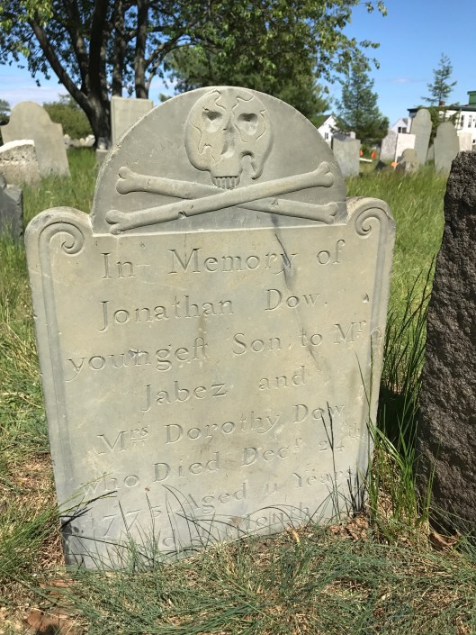 A very helpful sign explained that while the oldest dated cemetery marker comes from 1734, stones from as far back as 1652 have been found in earlier times. Unmarked field stones are plentiful. There’s also a mention of Indian attacks in the village during the 1600s that required mass burials. Currently, there are 200 names recorded of people buried at the Old Burial Ground but there are many, many more that remain anonymous.