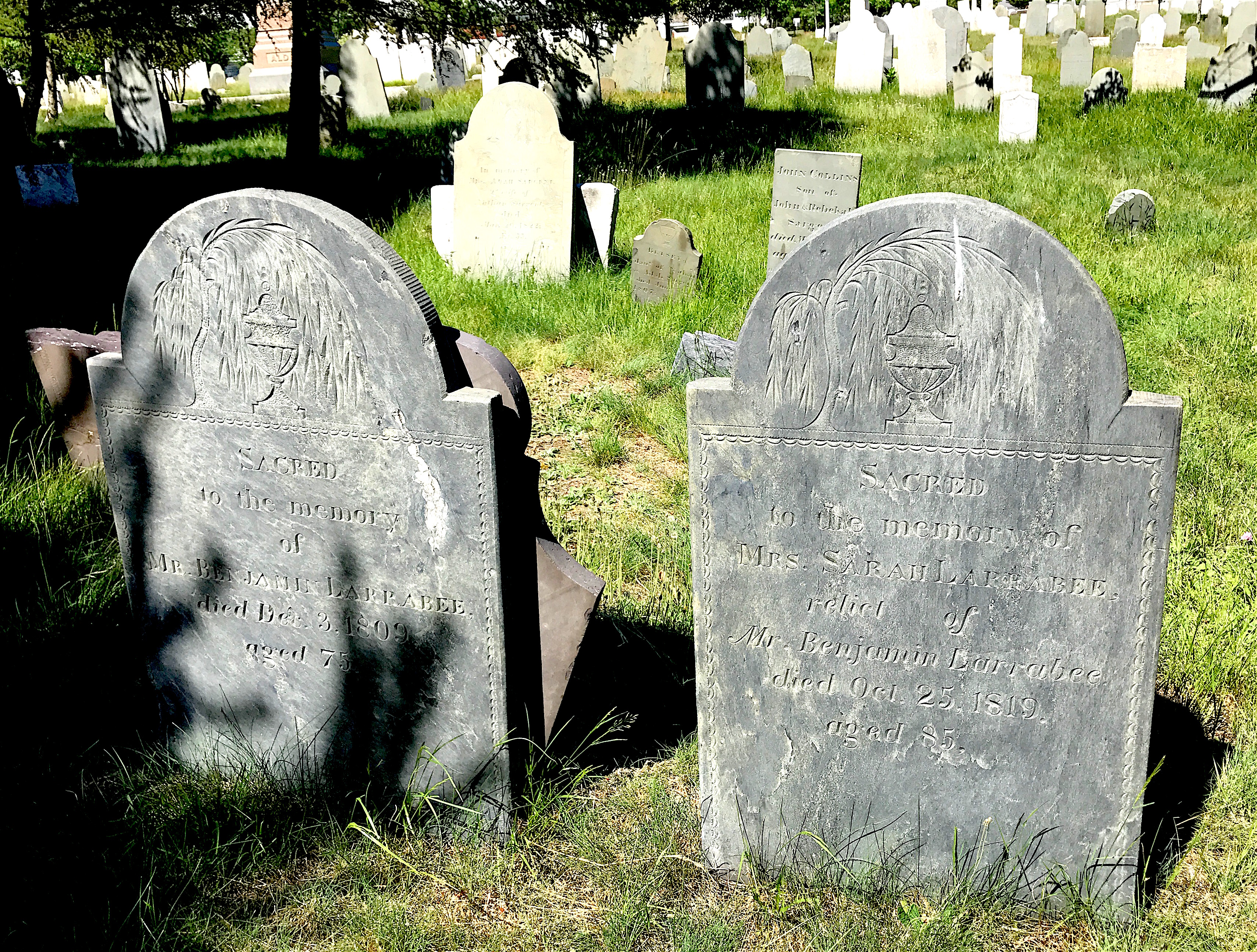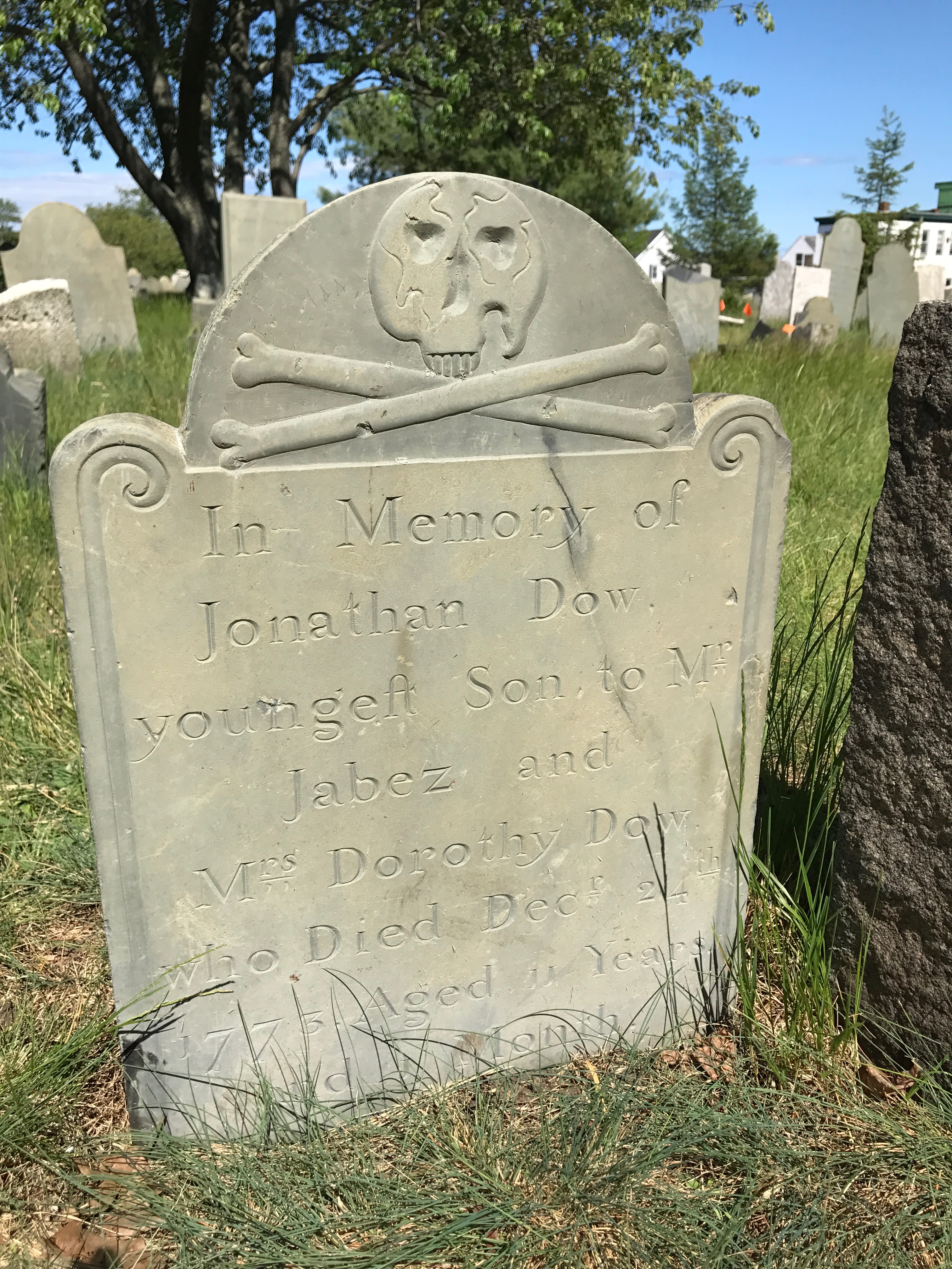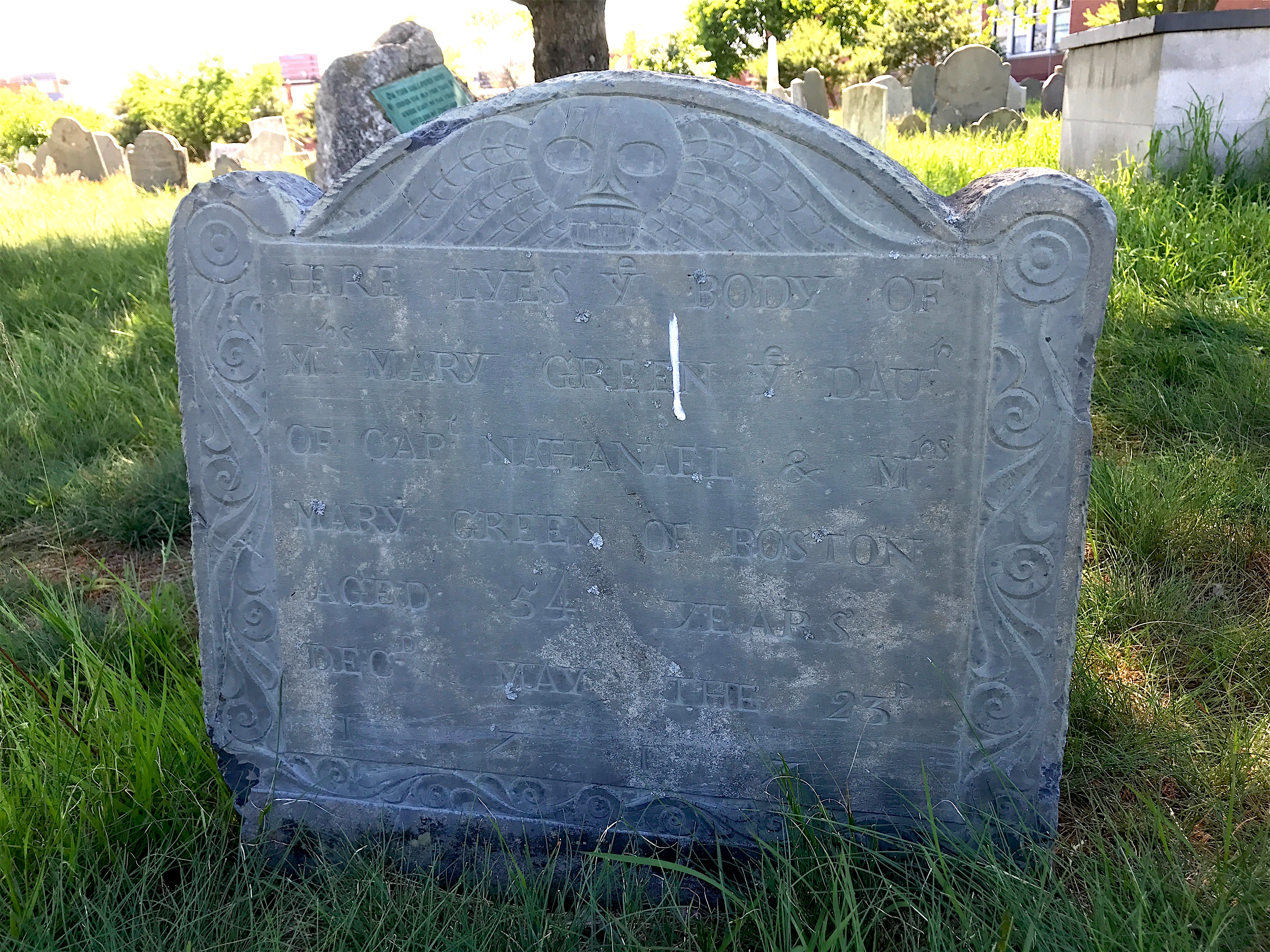 There was also a winged face marker (called a “soul effigy”) represented by the stone of Margaret Fletcher, who was married to a sea captain.