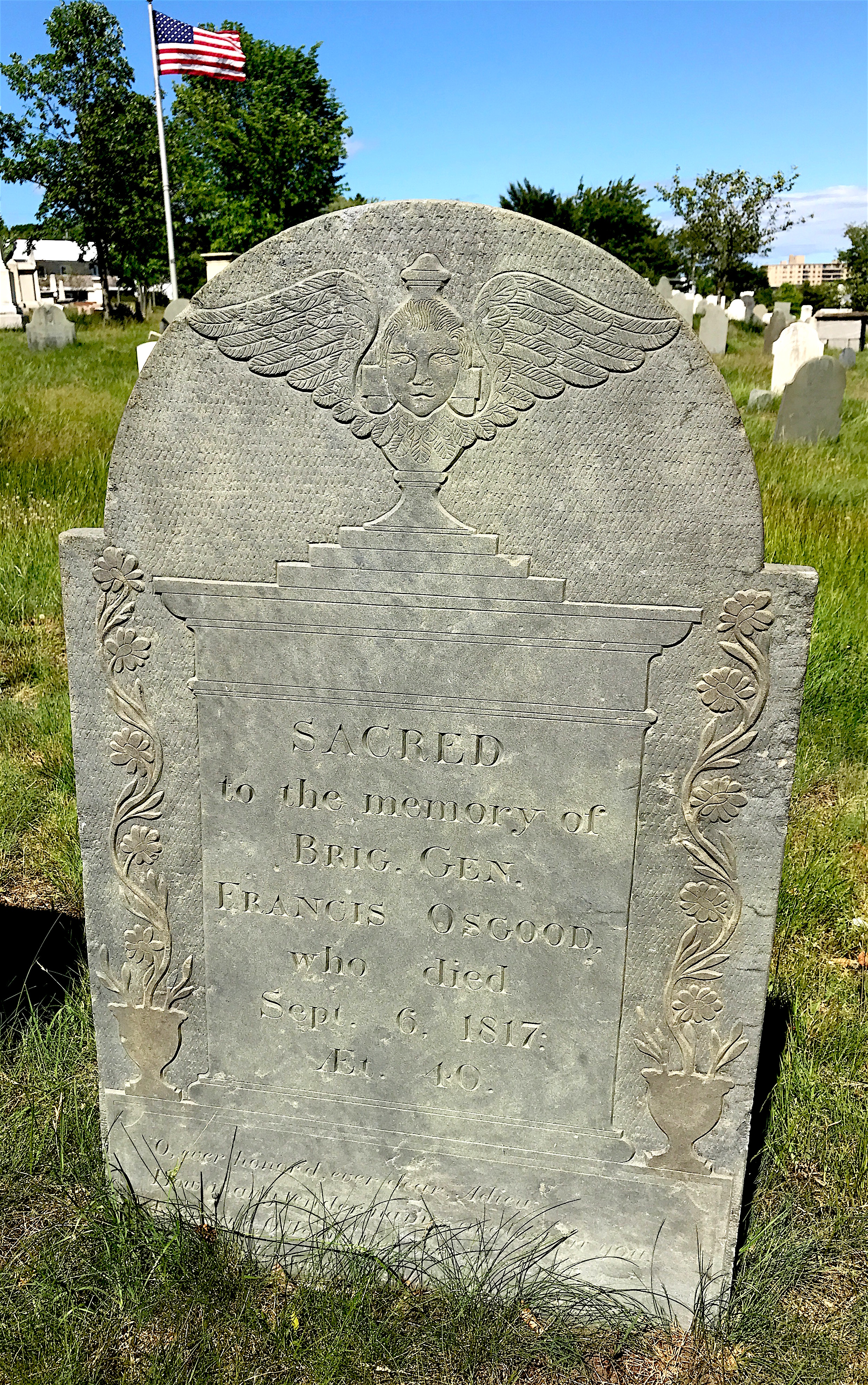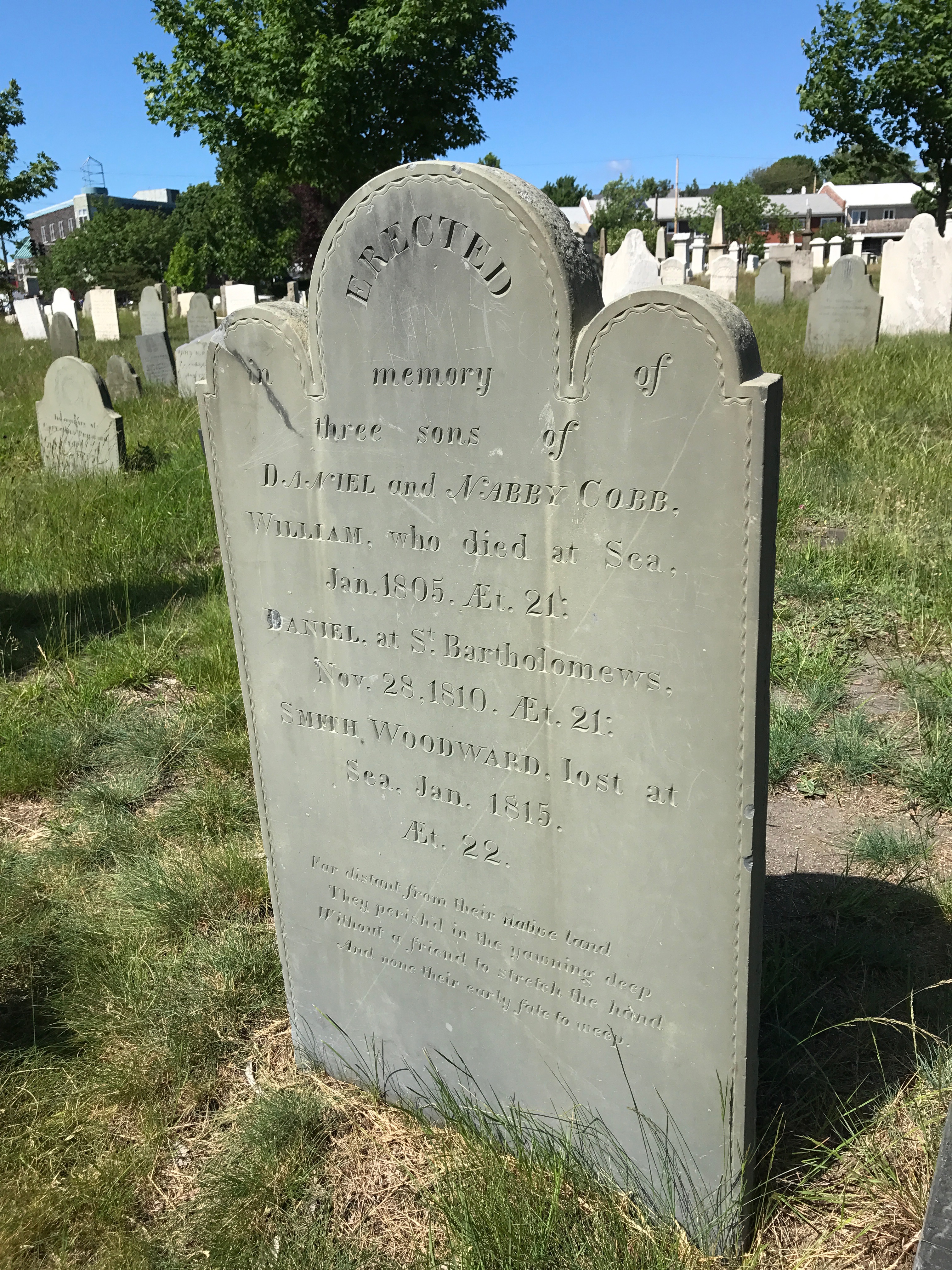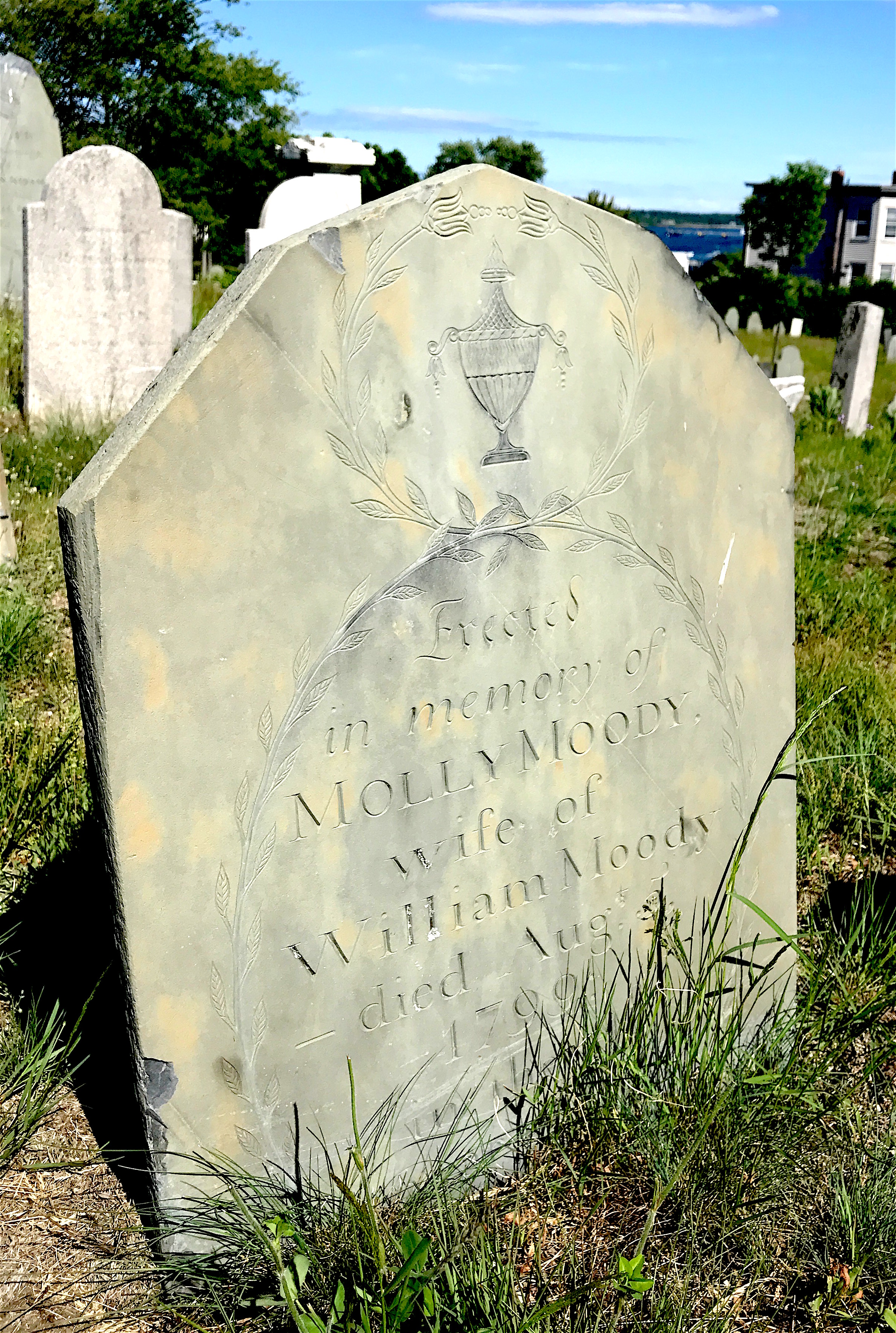 There was also a winged face marker (called a “soul effigy”) represented by the stone of Margaret Fletcher, who was married to a sea captain.