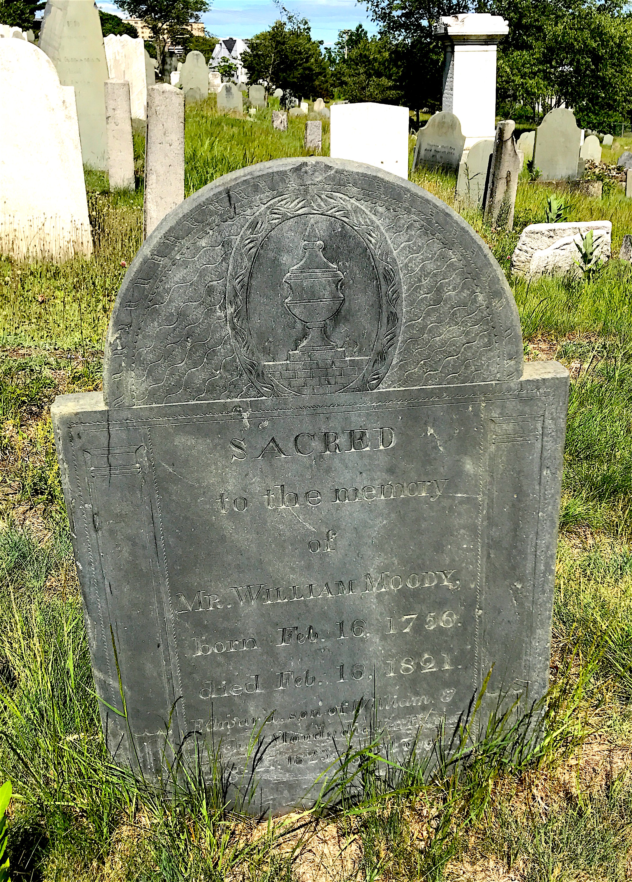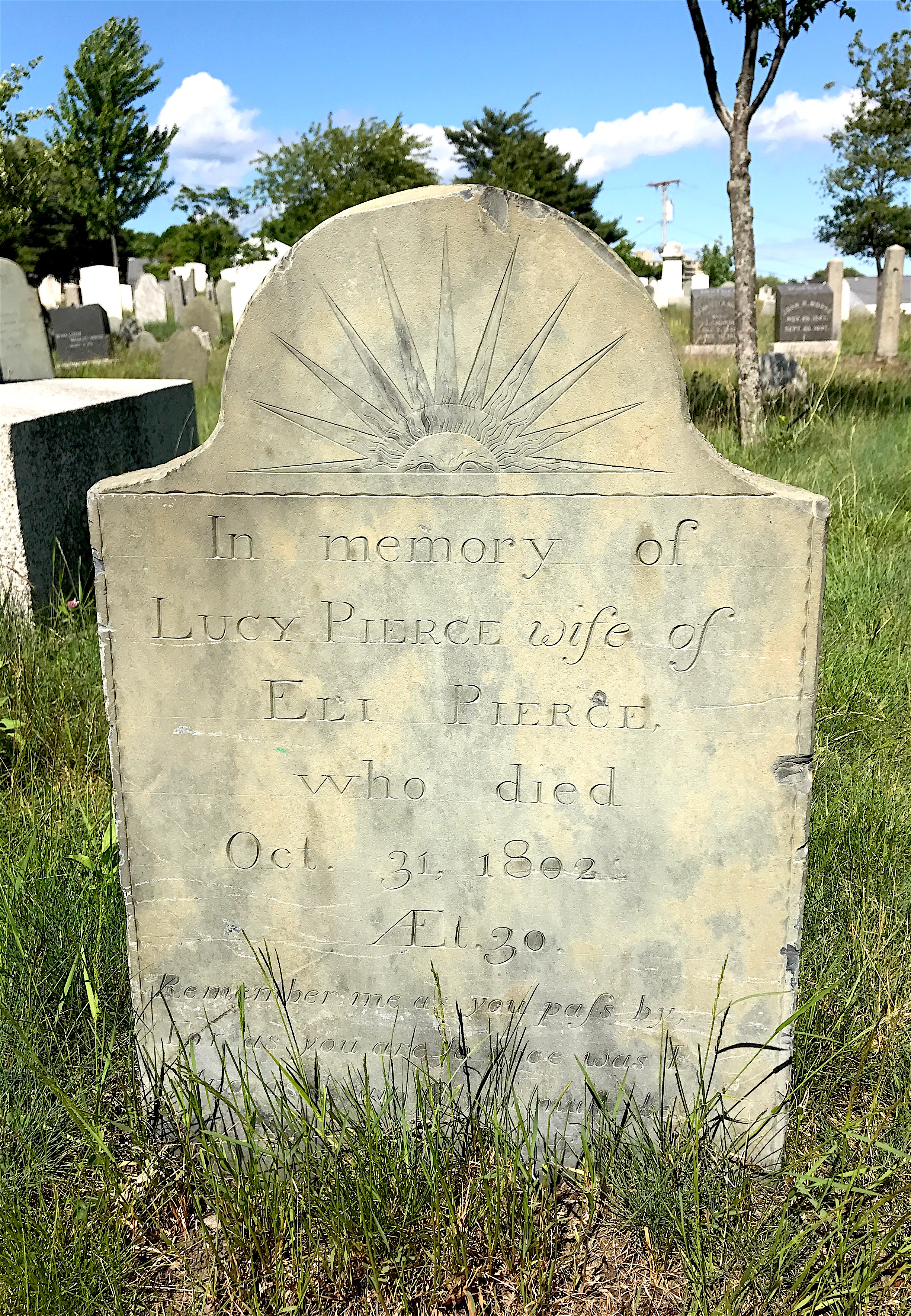 The sign also noted that like Eastern Cemetery, the Old Burying Ground includes stones from a reputable stonecutter. His name was Joseph Sikes, and he came from a family of stone cutters. Because his work is so similar to that of his son Elijah’s, it is often hard to tell who did what stone. Sometimes Elijah marked his stones with an “E.S.” at the bottom.