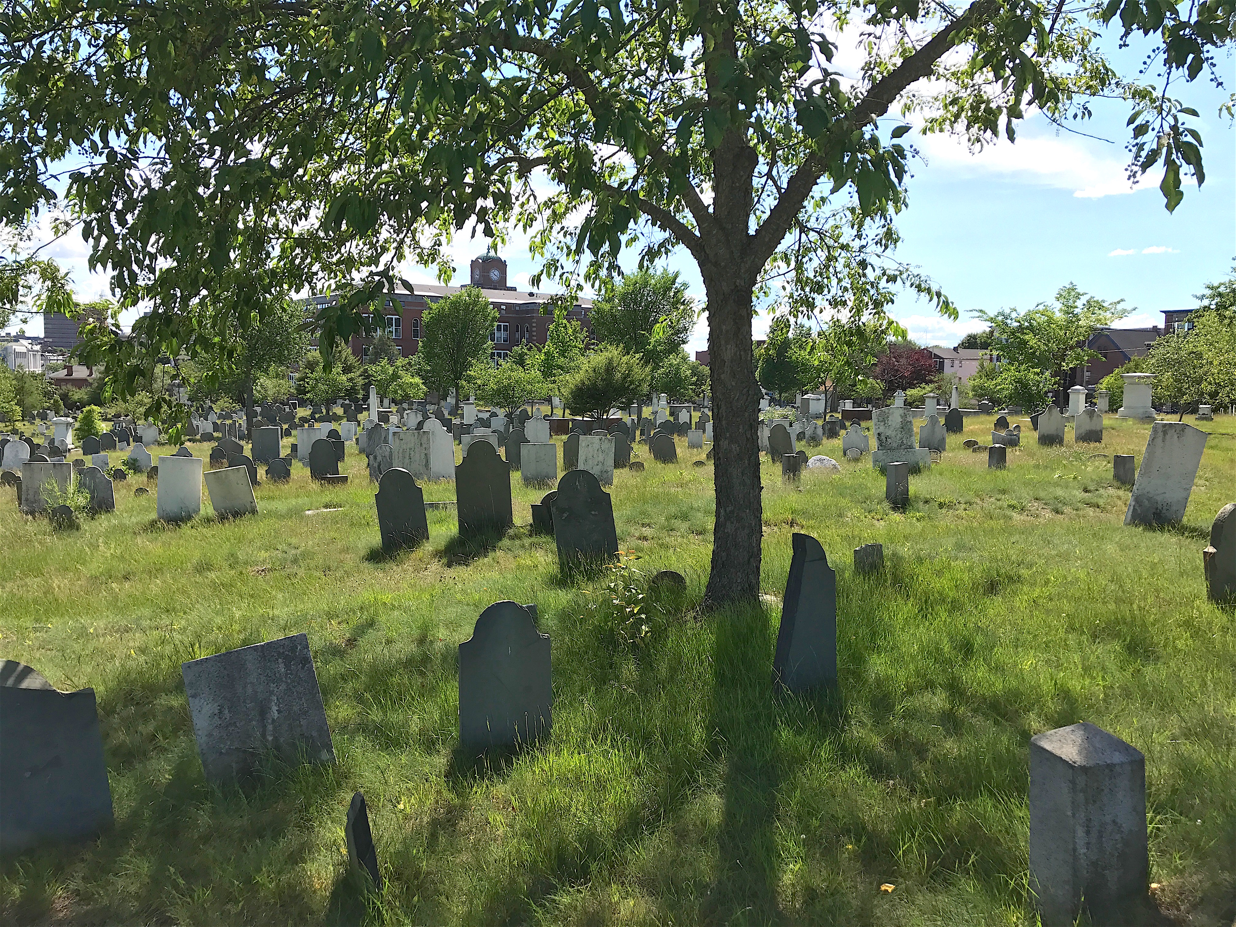 The Old Burying Ground has a variety of marker styles represented, from skulls to willow-shaded urns to modern recent ones. The familiar flying skull is on the slate marker of Ann Rodgers, who died at the age of 41. She even has her name on the back, too.