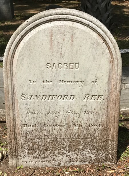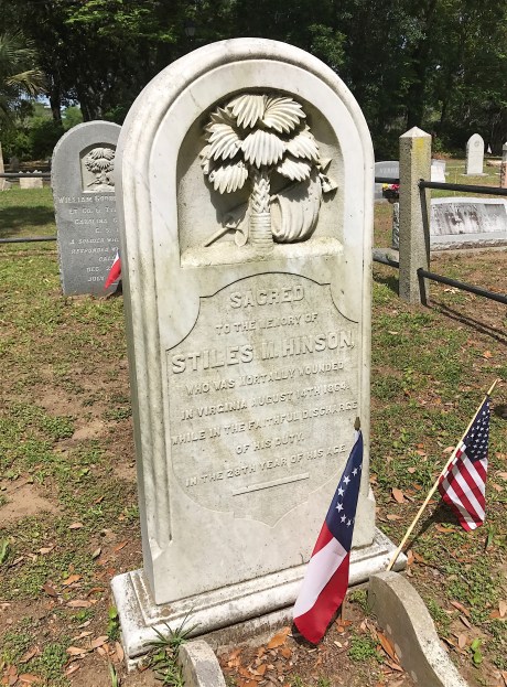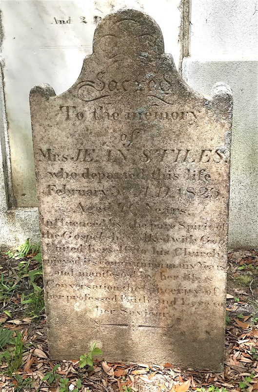 Finally, as an example of never knowing whom you might find in a cemetery, I present the grave marker of Jean “Jane” Scott Stiles. A few weeks ago, I wrote about the Stiles and Hinson families buried at James Island Presbyterian Church’s cemetery. I mentioned that Martha Stiles Hinson’s father was Benjamin Stiles. Martha’s mother was his first wife, Sarah Staples Stiles, who died when Martha was about 10.