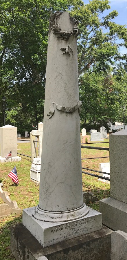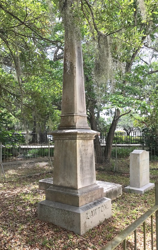 Also in the Lawton plot is the monument for Winborn Wallace Lawton III and his wife, Cecilia Lawton Lawton (yes, her maiden name was Lawton). Born in 1837, Winborn III was Winborn Jr.’s eldest son by his second wife, Martha. He served in the 10th Regiment of the South Carolina Infantry during the Civil War. He married Cecilia in 1864.