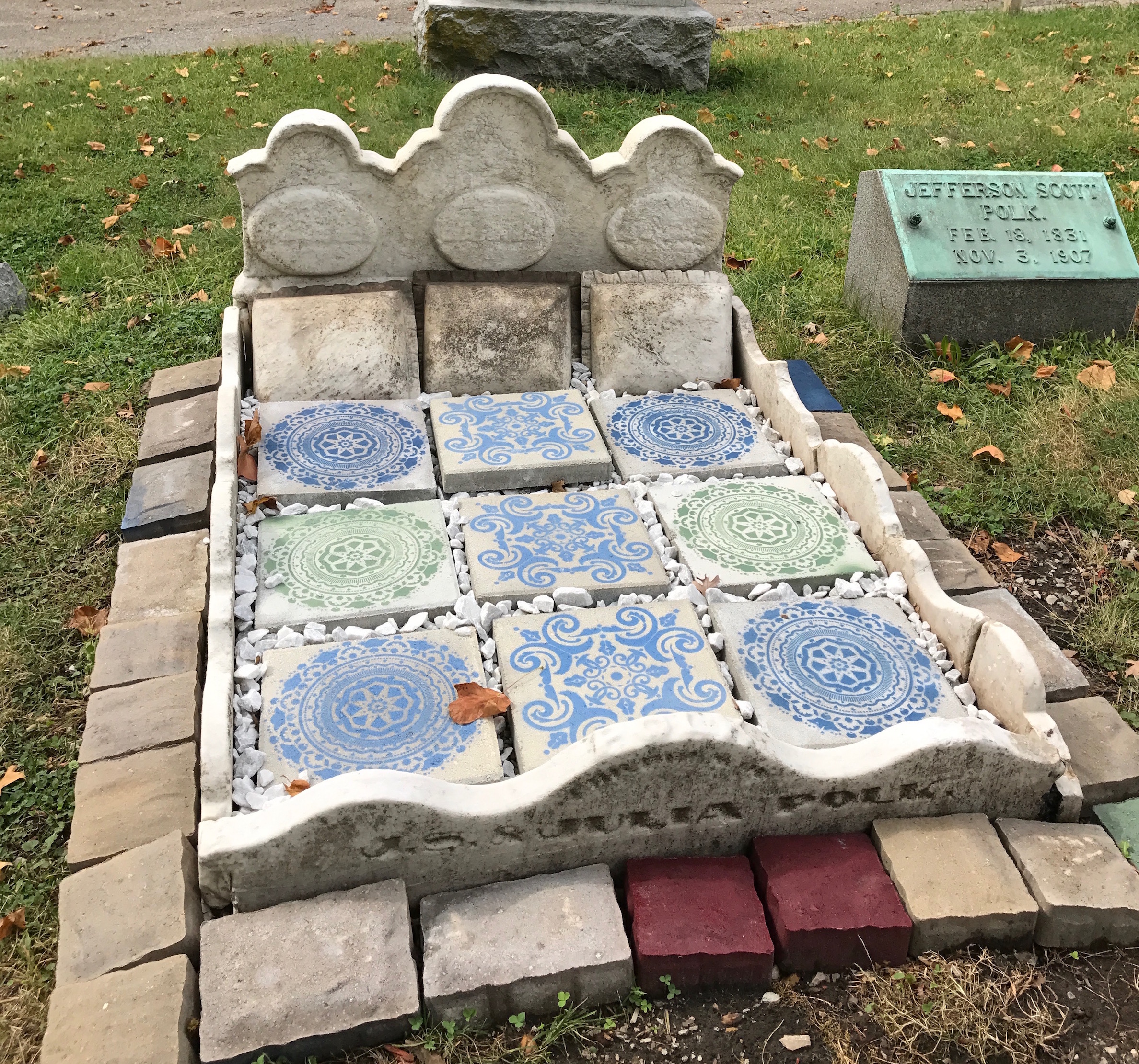 The Polk children’s “bed” grave marker was recently restored. Three stone pillows rest against the frame. Their parents, J.S. and Julia Polk, are buried beside them.