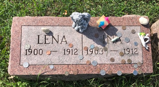 Not far away is the Stillinger family plot. Lena and Ina share the same stone. It, too, is covered in coins and trinkets.