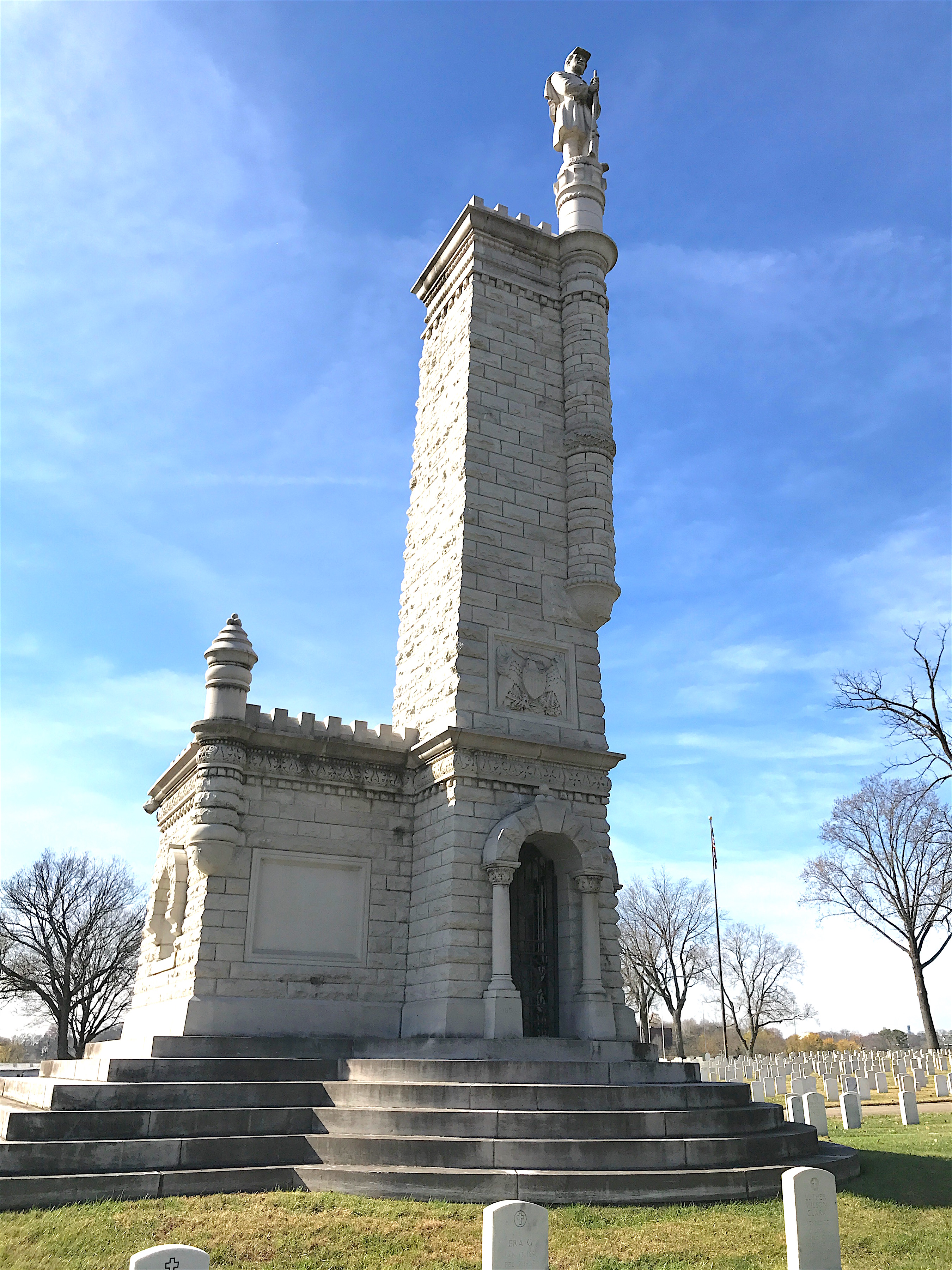 There’s an interesting footnote to this one. The Horne statue stands with his back to the massive Union Soldiers Tower next door at Knoxville National Cemetery. A few articles I read stated that family of the Horne brothers or the Horne brothers themselves insisted that any monument erected in their honor must have its back to the Union Soldiers Tower. Since it wasn’t constructed until 1901 and he died in 1891, I doubt William had a say in the matter. John, who died in 1906, might have but the truth is unknown.