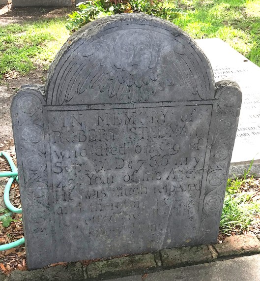 Frank also pointed out the slate marker of Robert Stedman (1723-1766), which is in wonderful condition for its age. A winged soul effigy with long hair decorates the top.