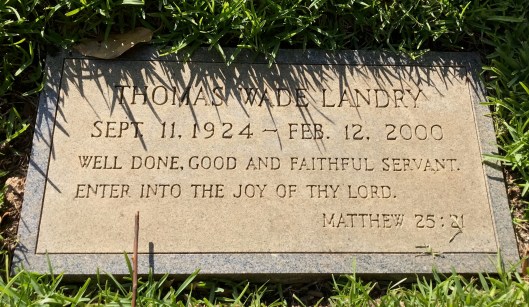 Landry died on Feb. 12, 2000 at the age of 75. His wife, Alicia Mildred “Honey” Wiggs Landry, died on Jan. 21, 2021 at age 91. Both are buried in the Landry plot. A large monument is behind them with a replica of the familiar fedora Landry was known to wear on the sidelines when he coached the Cowboys.