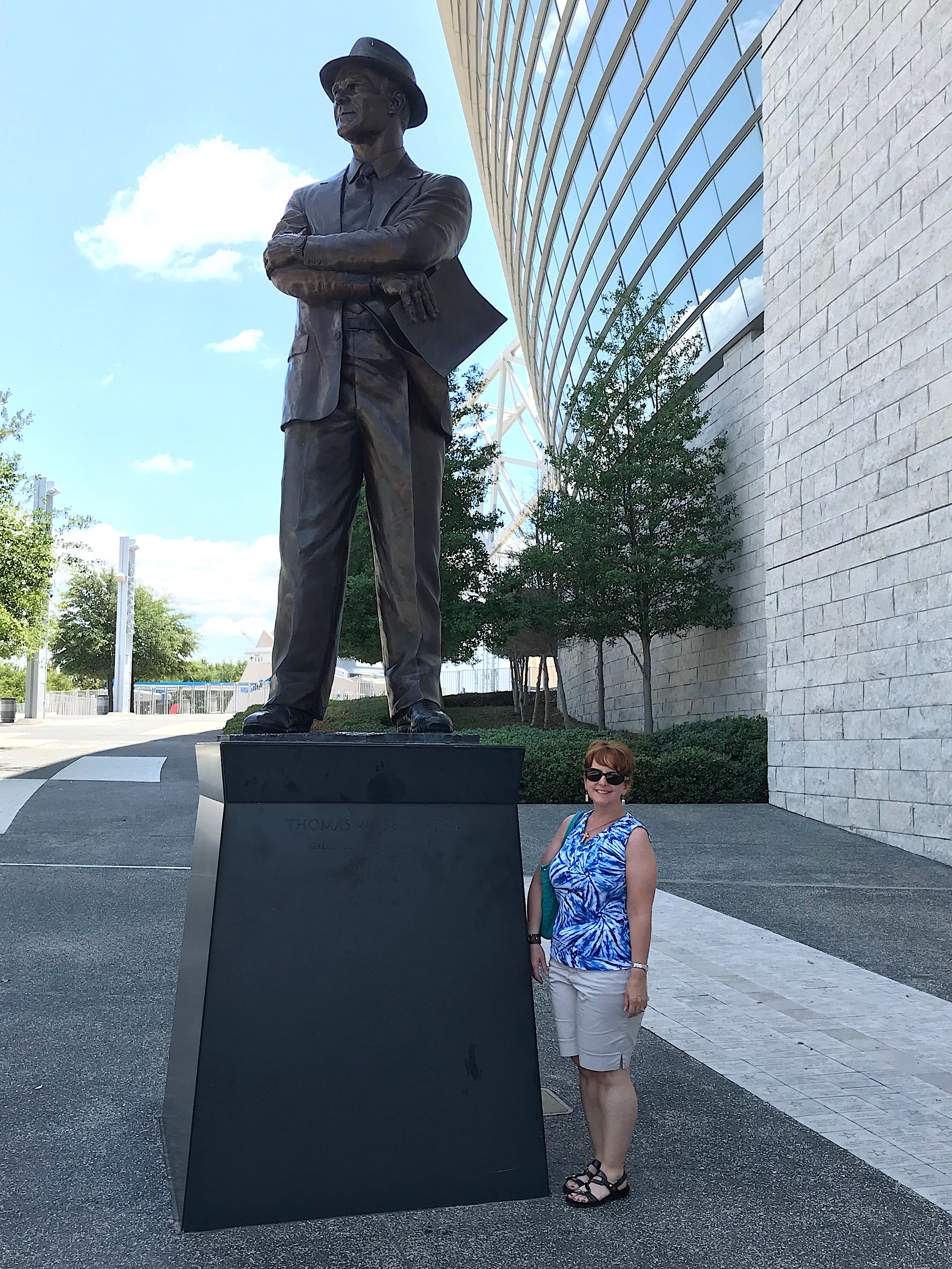Tom Landy’s statue at AT&T Stadium in Arlington, Texas (about 18 miles west of Dallas) features his trademark fedora he wore to Cowboys games.