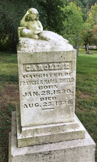 Edward Shield died at the age of two months in 1835. He shares his marker with his Aunt Caroline (who died in infancy in 1830) and Uncle Alfred (who died in infancy in 1821).