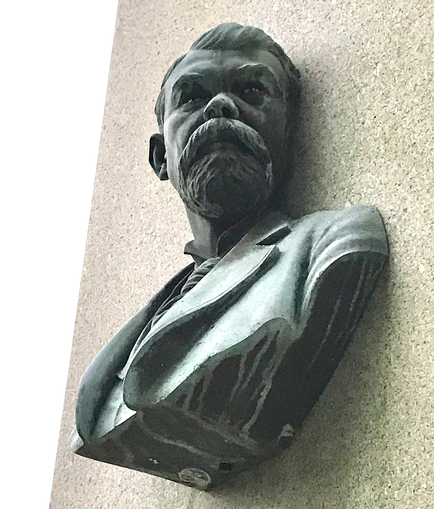 George Shield’s monument features a beaming likeness of the talented engineer along with some interesting symbols.