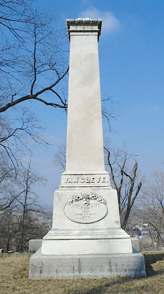 In his later years, Van Cleve became an accomplished musician, painter, botanist, and geologist. As founder of Woodland Cemetery, he served as president of the Woodland Cemetery Association from its inception until his death from tuberculosis in 1858. He is buried at Woodland but I did not have a chance to photograph his monument. So I am taking the liberty of borrowing a photo of it from Find a Grave.