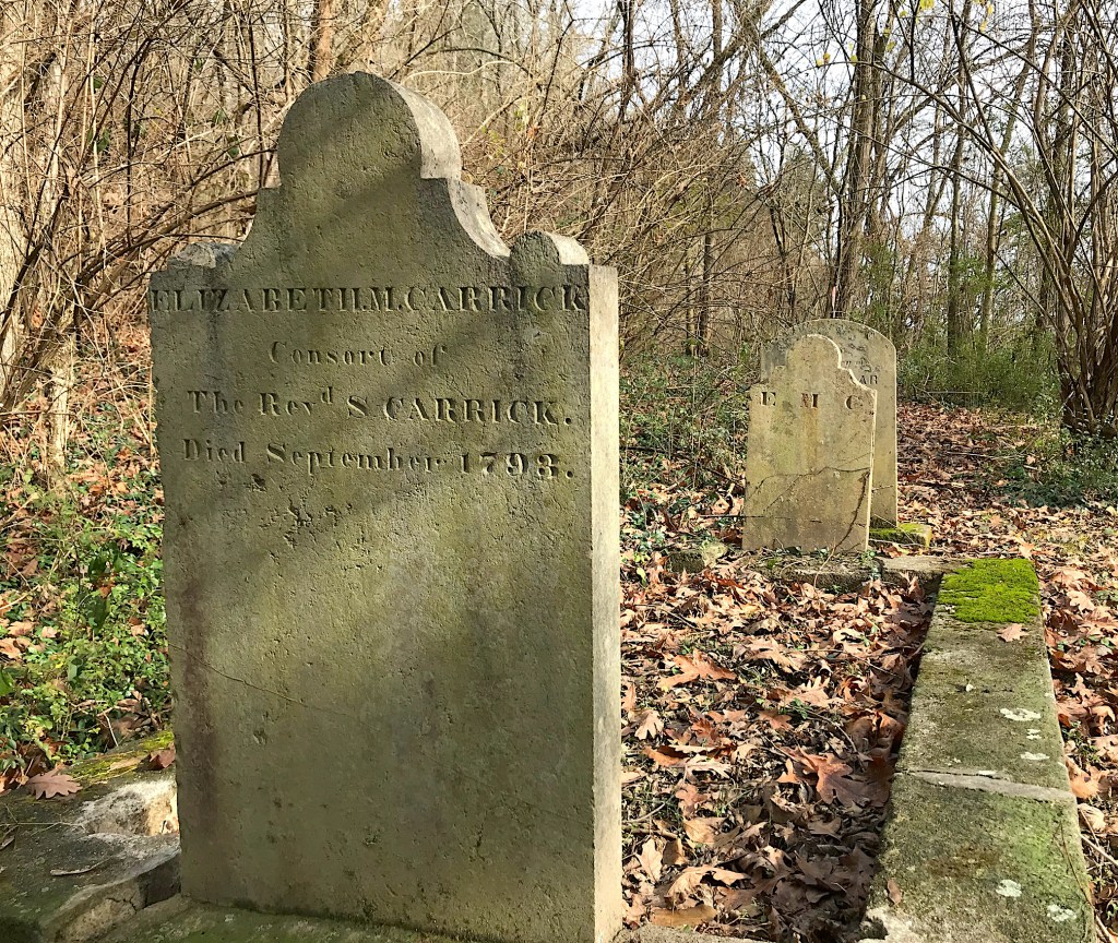 Let me back up and return to Rev. Carrick, who founded the church. He’s not buried in the cemetery but his first wife is. A native of Pennsylvania, Rev. Carrick married Elizabeth Moore in Virginia in 1779. The couple had their first child, Elizabeth, in 1783. They would move to Tennessee in 1791 when he helped establish the church.