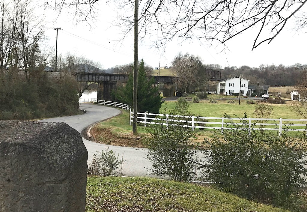 Lebanon in the Fork Cemetery is also known as Three Rivers Cemetery. That’s because it’s located on land overlooking the confluence of the Holston River with the French Broad River, where the “fork” and beginning of the Tennessee River is formed. The picture I took with my back to the cemetery (below) enables you to catch a glimpse of the water beneath the railroad bridge.