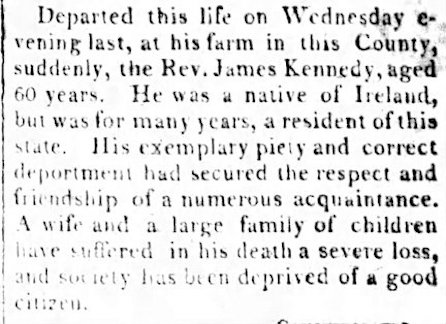 Some family-written research I found cast some light on some unhappiness that transpired between Mary Kennedy and one of her sons. She filed a suit against third child, Samuel, in 1841. The Rev. Kennedy’s will required James (21 at the time) and Samuel (then 37) to support their mother, Mary. She claimed in the suit: “Now may it please your Honour, the aforesaid Samuel Kennedy has in his possession all the most valuable part of the said Plantation, and has never contributed anything for the support of your oratrix and utterly refuses so to do.”