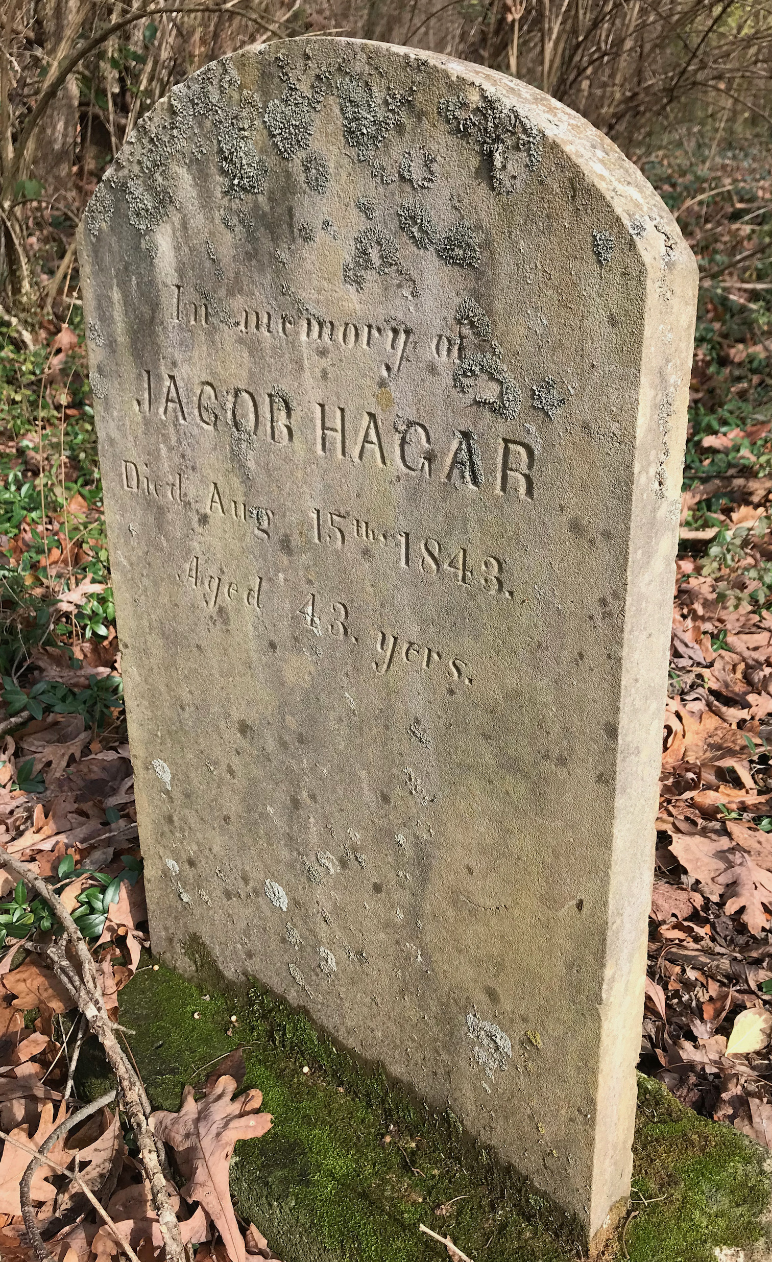 An interesting side note. There’s a marker right beside the footplate of Elizabeth Carrick’s grave for a man named Jacob Hagar. Little is known about him beyond the fact he lived from about 1800 and died on Aug. 15, 1843. He lived in Knox County in the 1830s and 1840s with his wife, Christina. In his will, he left to her “one cow, one bed, one bedsted (sic), & furniture, one big wheel, and cards, and the cotton on hand & one flax wheel.” He left each of his two sisters $1 each.