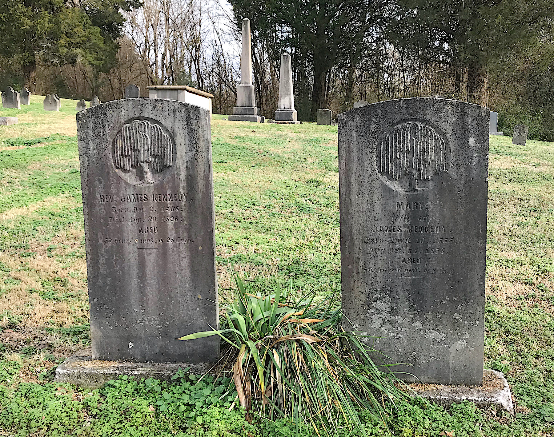Two markers for the Rev. John Kennedy and his wife, Mary Smith Kennedy, raised a few questions for me. Born in Ireland in 1768, Rev. Kennedy emigrated to America with his mother and six siblings. His father is thought to have died during the crossing. They settled in Pennsylvania, where Rev. Kennedy married Mary Smith of East Noddingham, Chester County, Penn. They moved to Tennessee and would have 10 children over the course of their marriage.
