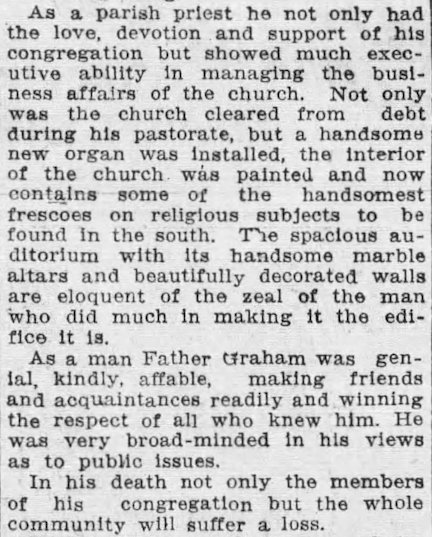 It was in 1902 that Father Graham came to Knoxville to become parish priest of the Church of the Immaculate Conception. He became a much beloved member of the community, and his congregants held him in great affection and respect. His death notice in the Knoxville Sentinel expounded on this.