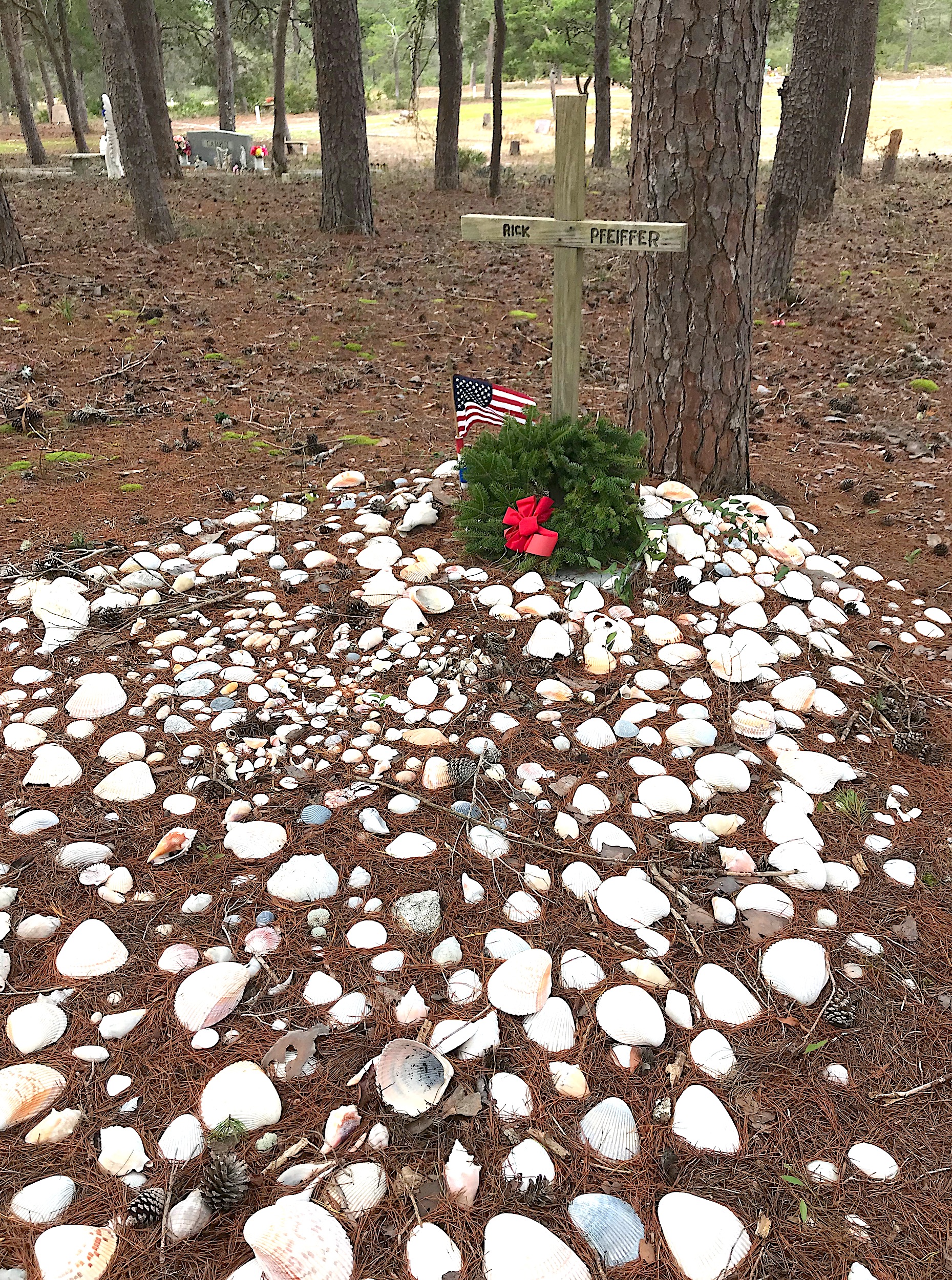 A native of Milwaukee, Wisc., Richard “Rick” Pfeiffer (1942-2004) was a Vietnam veteran who spent his final years in Florida. His grave is covered in many different kinds of shells. There’s also a bench positioned across from the grave which tells me there are folks who come to sit a spell with Rick and share a cup of coffee from time to time.