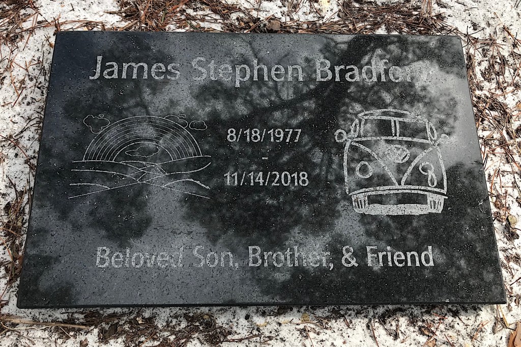 Born in 1977 in Tallahassee, Fla., Jim spent much of his life there. According to his obituary, Jim had many hobbies including playing the drums and guitar, attending music festivals, traveling the country in his Volkswagon bus (which you can see on his marker), and riding ATVs with his father and brother.