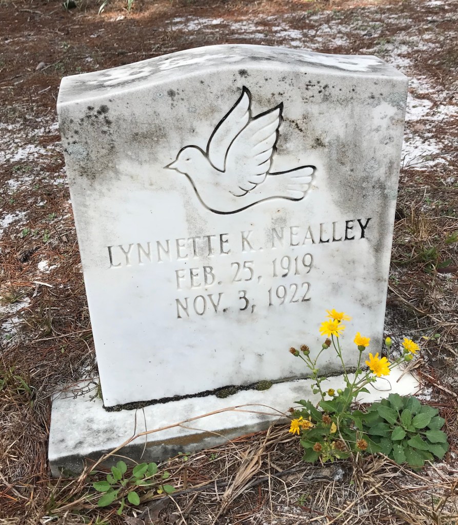 This last grave is for a child, Lynnette K. Nealley. She was the daughter of watchmaker Lynn Leroy Nealley and Evalina Woodland Nealley. She was the youngest of their four children. The family moved from Kansas to Florida before Lynnette was born. Lynette was only three when she died on Nov. 3, 1922.