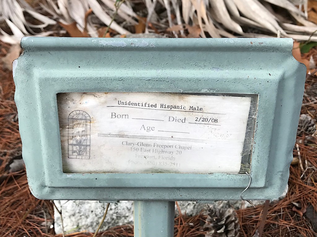 But I think one of the saddest markers I’ve ever seen was this one for “Unidentified Hispanic Male” who died on February 2, 2008. I have seen temporary funeral home markers like this many times before, which are placed to mark a grave until a stone can be placed. But I have never seen one like this that had no name of any kind, just a date.