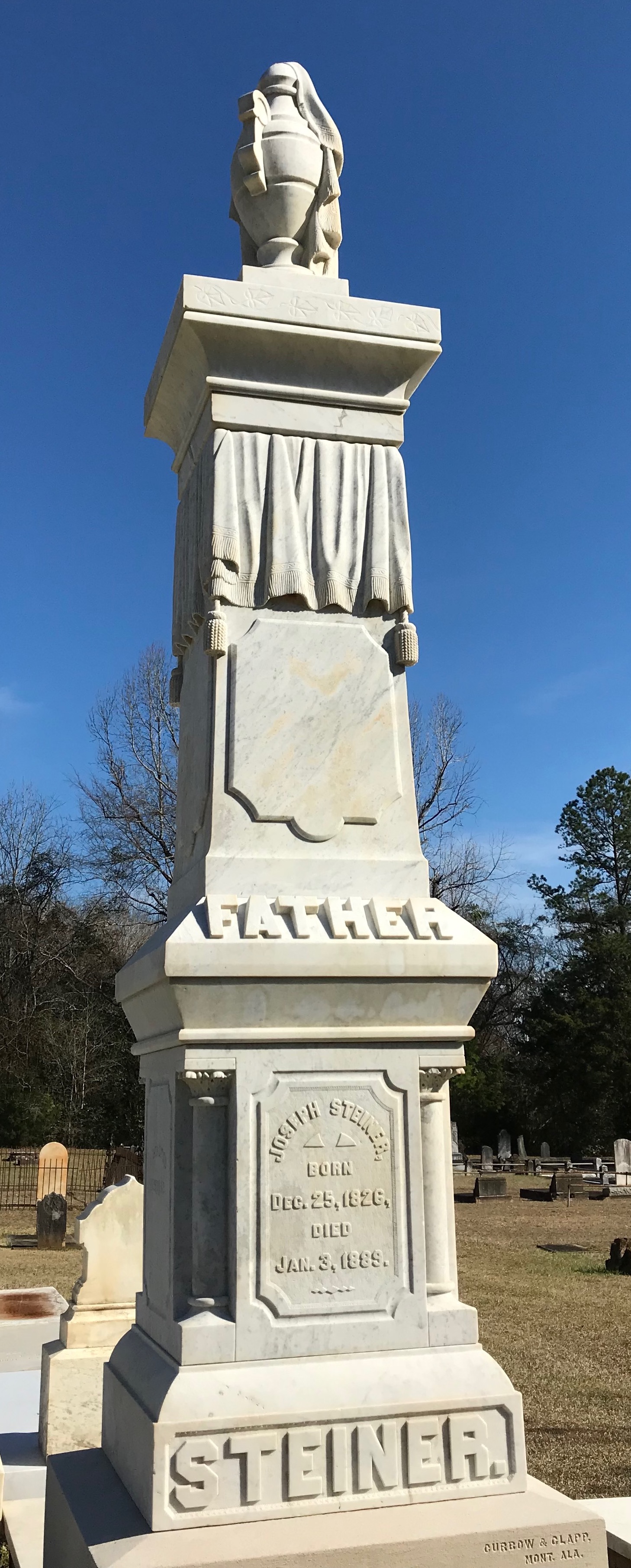 You might think it was also done by McDonald, March & Co. but it wasn’t. Instead, Joseph Steiner’s monument is signed by Montgomery, Ala. firm Curbow & Clapp. By the time Joseph Steiner died in 1889, Daniel McDonald had already passed away.