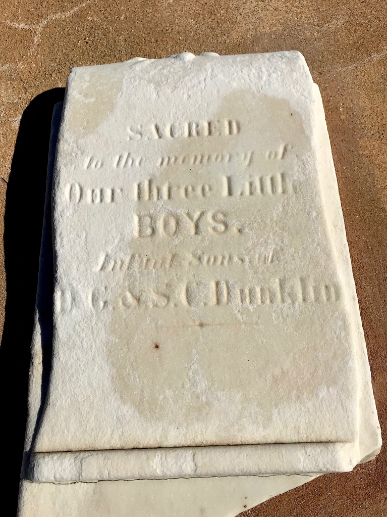 Yes, that’s the mark of McDonald, March & Co. They carved the monument for the Dunklin children over at Pioneer Cemetery. You’ll notice, however, that they chose a different lettering style or “font” from the Dunklin one to use on Bettie’s monument.