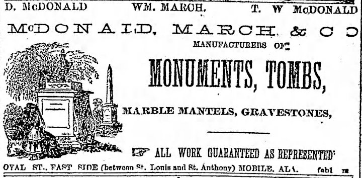 Newspaper ads for their business state that the partnership began in 1850. The pair are probably best known for their involvement in the long process to create the large Confederate monument on Capitol Hill in Montgomery, Ala. They are sometimes given credit for the entire monument but it turns out they were brought in midway when communication between the Ladies Memorial Association (LMA) with designer/sculptor Alexander Doyle broke down. The story behind that monument’s creation is quite interesting.