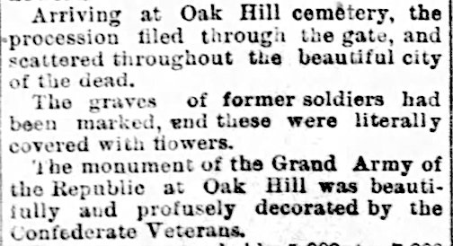 Oak Hill’s GAR monument was erected on April 27, 1891 when the state’s GAR convention took place in Birmingham. The convention was reported in the The Birmingham News and included erection of the new monument, witnessed by about 75 Union veterans. You can see on the monument that it was erected by Birmingham’s Gen. George A. Custer Chapter, Post 1.