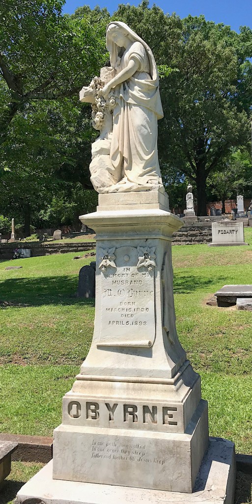 The monument for Irish immigrant Michael O’Byrne and his wife, Sarah, is rather striking. I didn’t know when I saw it at Oak Hill that I would see one with a statue almost exactly like it at Oak Grove Cemetery in Brunswick, Ga. in 2020.