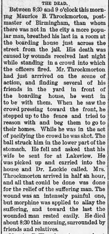 At some point after 1880, the family moved to Birmingham. Michael died on April 5, 1893 at the age of 61. Oddly, his obituary states that he was a “pioneer” who came to Birmingham when it was a “struggling village”. Considering he didn’t live there until after 1880, that doesn’t make sense. It also states he was the brother of “our P.O. O’Byrne”. I did some research and P.O. O’Byrne (who did live and work in Eufaula and Birmingham) was 26 years younger than Michael O’Byrne. I think there may have been some confusion over exactly who Michael was.