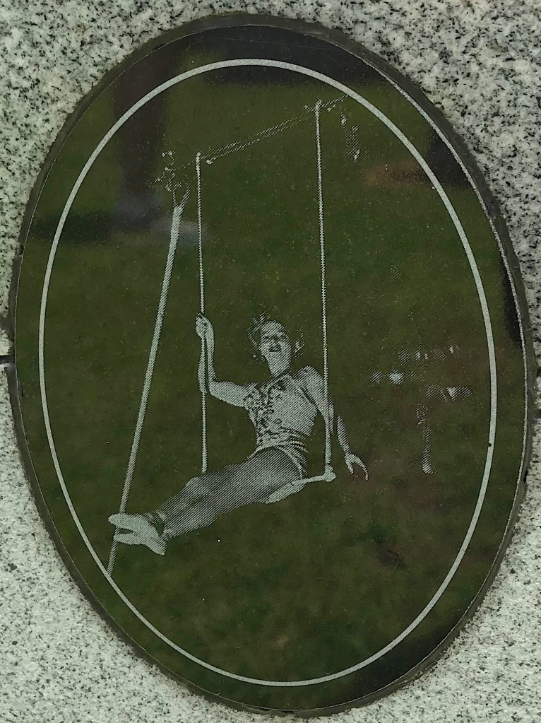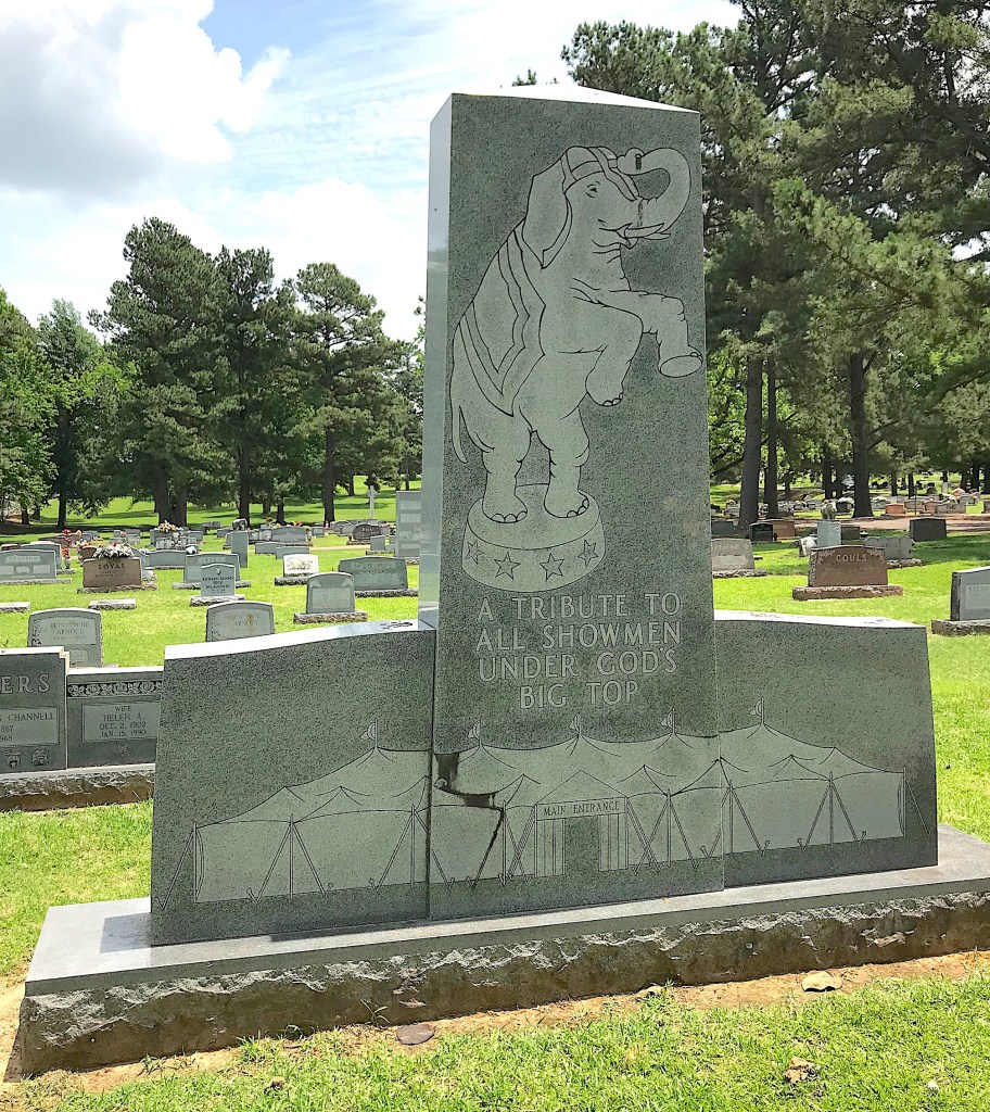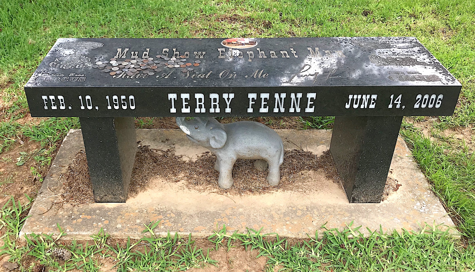 Then there’s Terry Fenne, who has a bench to mark his grave that invites guest to “Have A Seat On Me”. Not only does if feature Terry with one of his elephants, it is embossed with the emblems of the circuses he worked for. Beneath the bench is a little elephant statue. He was known as the “Mud Show Elephant Man”.