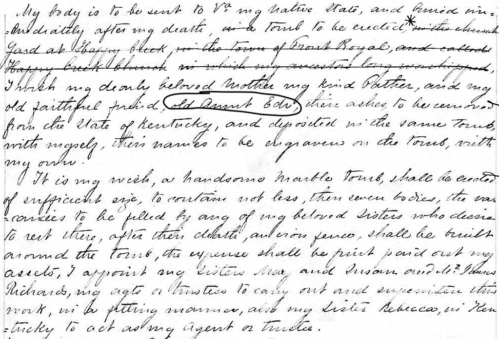 You will note (and I have circled her name) that Robert specifically asked that the “ashes” of his parents and “my old faithful friend, old Aunt Edy” be moved from Kentucky to the new Bayly tomb. He does not refer to Aunt Edy as a servant or a slave in his will.