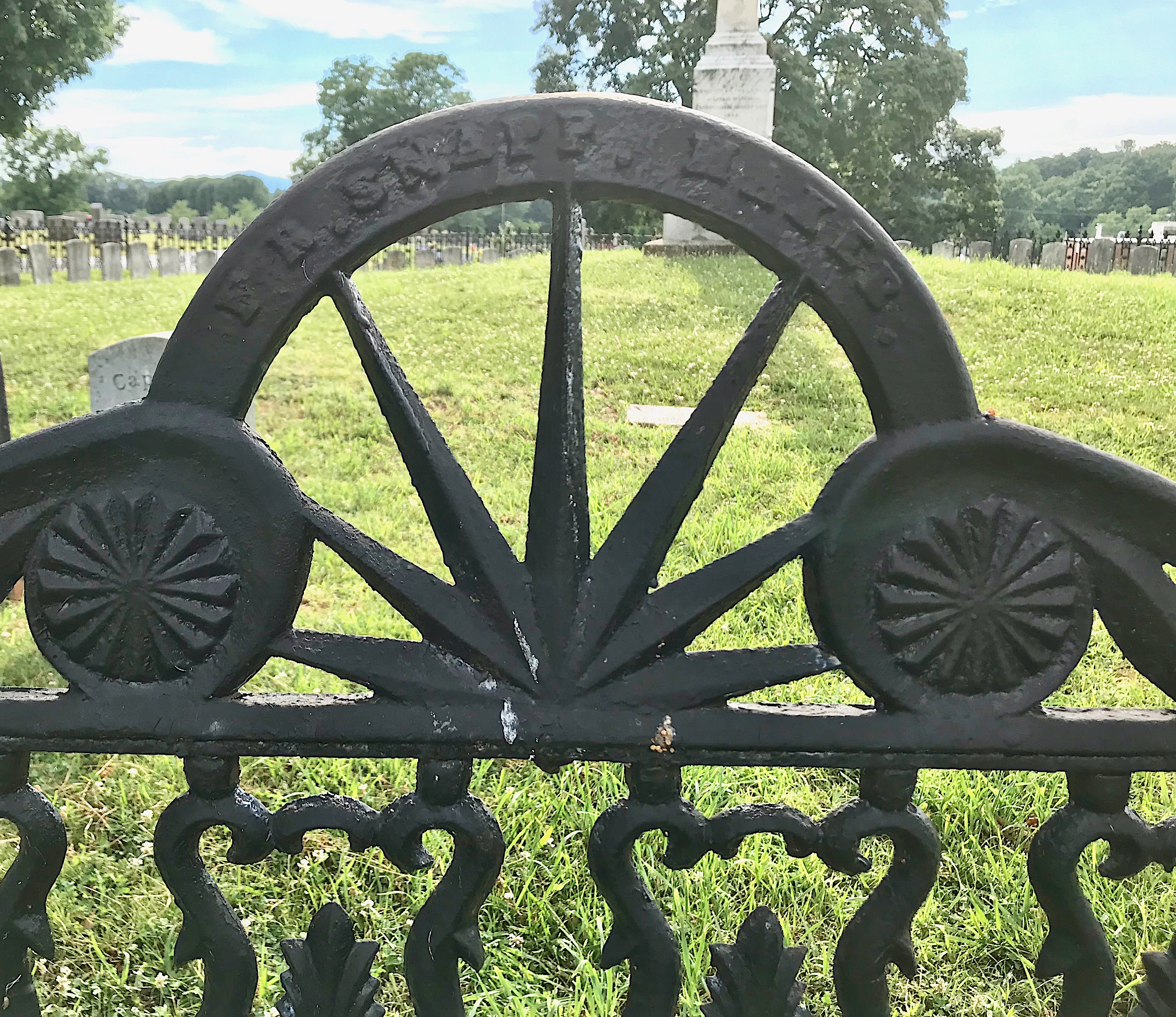 I noticed how intact the iron fence was that surrounds the graves and got a picture of the gate. It was produced locally by the F.R. Snapp Foundry, located 20 miles away in Winchester, Va. Francis R. Snapp established the foundry after the Civil War and operated it until his death in 1872. His wife, Theodora, took over running it after he died. I think his sons were key to keeping it going.